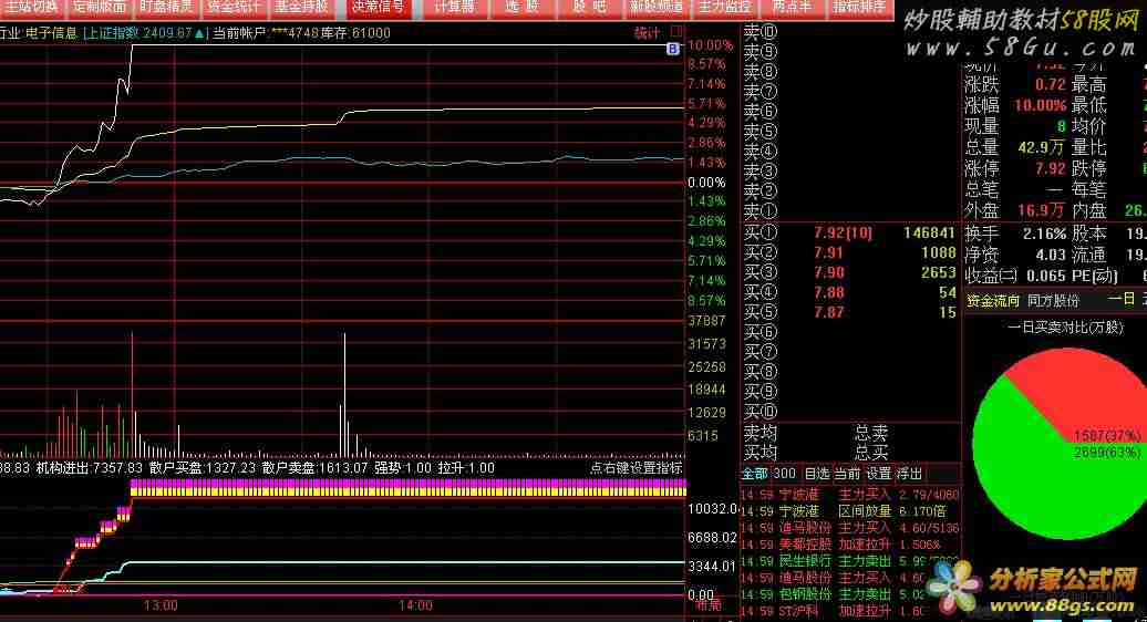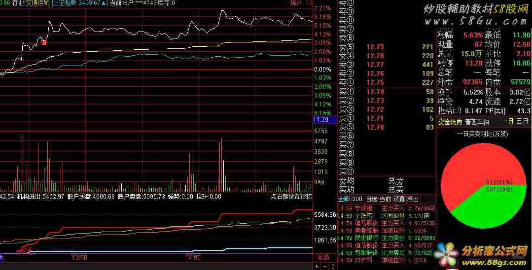 A1:=SUM(IF(CLOSE>REF(CLOSE,1),VOL/CAPITAL*100,IF(CLOSE<REF(CLOSE,1),-VOL/CAPITAL*100,0)),0); 成交额:=V*C/100,NODRAW;{万元} A2:=SUM((IF(((成交额/8>20) AND (CLOSE>(REF(CLOSE,1)))),成交额,0)),0); A3:=SUM((IF(((成交额/8>20) AND (CLOSE<(REF(CLOSE,1)))),成交额,0)),0); A4:=SUM((IF(((成交额/8<20) AND (CLOSE>(REF(CLOSE,1)))),成交额,0)),0); A5:=SUM((IF(((成交额/8<20) AND (CLOSE<(REF(CLOSE,1)))),成交额,0)),0); A6:=((A2+A3)+A4)+A5; A7:=IF((ISLASTBAR),((100*A2)/A6),0); A8:=IF((ISLASTBAR),((100*A3)/A6),0); A9:=IF((ISLASTBAR),((100*A4)/A6),0); A10:=IF((ISLASTBAR),((100*A5)/A6),0); 增减仓%:A1; 机构买盘:(A2),LINETHICK6,COLORRED; 机构卖盘:(A3),LINETHICK6,COLORFFFF55; 机构进出:机构买盘-机构卖盘,NODRAW; 散户买盘:(A4),COLOR5555FF;{细红线} 散户卖盘:(A5),COLOR55FF55;{细绿线} 强势:((100*A2)/A6>50); STICKLINE(强势,机构买盘*1.02,机构买盘*1.1,1,0),COLORYELLOW; 拉升:((100*A2)/A6-(100*A3)/A6)>18 AND (100*A2)/A6-(100*A5)/A6>18; STICKLINE(拉升,机构买盘*1.1,机构买盘*1.2,1,0),COLORFF00FF; DRAWTEXT(ISLASTBAR=1,机构买盘*0.95,'●机构买盘'),LINETHICK2,COLORRED; DRAWTEXT(ISLASTBAR=1,机构卖盘*0.95,'○机构卖盘'),LINETHICK2,COLORFFFF55; DRAWTEXT(机构进出>0 AND REF(机构进出,1)<=0,机构买盘*1.02,'●机买'),COLORRED; DRAWTEXT(机构进出<0 AND REF(机构进出,1)>=0,机构买盘*0.98,'○机卖'),COLORFFFF55;