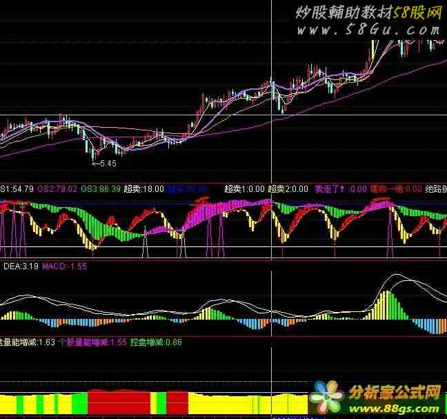 大V3:=MA(INDEXV,3); 大V60:=MA(INDEXV,60); 1,COLORYELLOW; 大盘量能增减:(大V3/大V60),COLORYELLOW,LINETHICK0; DD:=大盘量能增减<1; V3:=MA(VOL,3); V60:=MA(VOL,60); 个股量能增减:(V3/V60),COLORFF00FF,LINETHICK0; AA:=个股量能增减>1; 成交:=VOL/AMOUNT; 平3:=MA(成交,3); CC:=MA(成交,60); 控盘增减:平3/CC,COLORWHITE,LINETHICK0; STICKLINE(控盘增减>1,0,控盘增减,8.10,0),COLORFF00FF; STICKLINE(控盘增减<1,0,控盘增减,8.10,0),COLORGREEN; STICKLINE(控盘增减<1 AND AA,0,控盘增减,8.10,0),COLORYELLOW; STICKLINE(控盘增减>1 AND DD,0,控盘增减,8.10,0),COLOR0000CC; BB:=控盘增减<1; 异动天数:=BARSLAST(BB),COLORYELLOW,LINETHICK0;