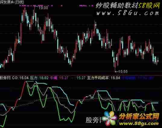 N:=3; CG:MA((LOW+HIGH+CLOSE*2)/4,N); FL:=HHV(CG,3),COLORGREEN,POINTDOT; FS:=IF(CG<FL,(CG-(FL-CG)),FL),COLORGREEN,; FL1:=HHV(CG,5),COLORGREEN,POINTDOT; FS1:=IF(CG<FL1,(CG-(FL1-CG)),FL1),COLORGREEN,; FL2:=HHV(CG,7),COLORGREEN,POINTDOT; FS2:=IF(CG<FL2,(CG-(FL2-CG)),FL2),COLORGREEN,; FL3:=HHV(CG,9); 压力:IF(FL3>C,FL3,DRAWNULL),COLORCYAN,LINETHICK2; 牛绳:IF(CG<FL3,(CG-(FL3-CG)),FL3),LINETHICK0; IF(牛绳>=FL3,牛绳,DRAWNULL),COLORRED,LINETHICK2; IF(牛绳<FL3,牛绳,DRAWNULL),COLORGREEN,LINETHICK2;