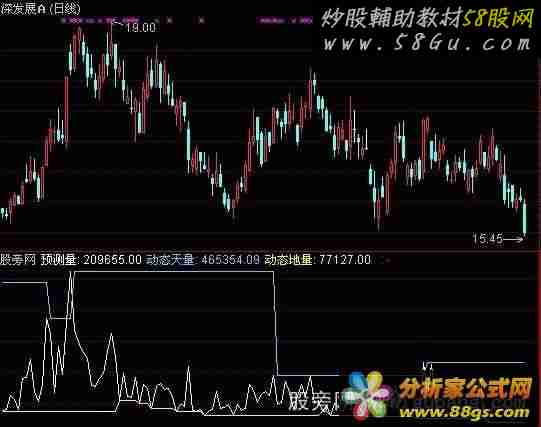 预测量:IF(CURRBARSCOUNT=1 AND PERIOD=5,VOL*240/FROMOPEN,VOL); 动态天量:IF(REF(V,1)=HHV(V,20),REF(V,1),REF(REF(V,1),BARSLAST(REF(V,1)=HHV(V,20)))),COLORFFCC66; 动态地量:IF(V=LLV(V,20),V,REF(V,BARSLAST(V=LLV(V,20)))),COLORYELLOW;