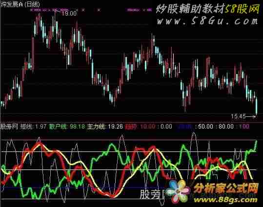 短线:"kdj.j"(5,3,3),coloraaaaaa; 散户线: 100*(HHV(HIGH,60)-CLOSE)/(HHV(HIGH,60)-LLV(LOW,60)),LINETHICK3,color00ff00; RSV30:=(CLOSE-LLV(LOW,30))/(HHV(HIGH,30)-LLV(LOW,30))*100; K30:=SMA(RSV30,5,1); D30:=SMA(K30,3,1); J30:=3*K30-2*D30; 主力线:EMA(J30,6),COLORYELLOW,LINETHICK3; rsv21:=(CLOSE-LLV(LOW,21))/(HHV(HIGH,21)-LLV(LOW,21))*100; k21:=SMA(rsv21,13,8); 趋势:CEILING(SMA(k21,13,8)),COLORRED,LINETHICK4; 0;20;50;80;100; |