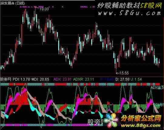 STICKLINE(ADX>=ADXR,100,105,3,0),COLOR0000FF; RSV:=(CLOSE-LLV(LOW,9))/(HHV(HIGH,9)-LLV(LOW,9))*100; K:SMA(RSV,3,1),LINETHICK0; D:SMA(K,3,1),LINETHICK0; J:3*K-2*D,COLOR00FF00,LINETHICK1; DRAWBAND(K,RGB(220,0,220),D,RGB(180,140,140)); STICKLINE(C>0,0,-5,3,1),COLORFFFF00; STICKLINE(K>=D,0,-5,3,0),COLORFF00FF; DRAWTEXT(CURRBARSCOUNT=8,100,'ADX金叉ADXR'),COLORFFFF00; DRAWTEXT(CURRBARSCOUNT=7,-7,'KDJ金叉'),COLORFFFF00; DRAWTEXT(CURRBARSCOUNT=6,55,'PDI与MDI'),COLORFFFF00; |