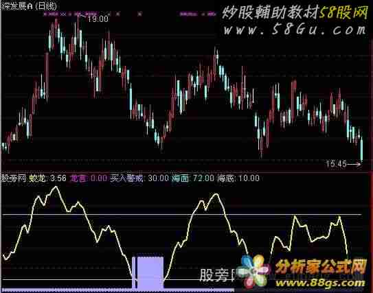 蛟龙: 3*SMA((CLOSE-LLV(LOW,27))/(HHV(HIGH,27)-LLV(LOW,27))*100,5,1)-2*SMA(SMA((CLOSE-LLV(LOW,27))/(HHV(HIGH,27)-LLV(LOW,27))*100,5,1),3,1),LINETHICK2 , COLORYELLOW; 龙宫: IF(CROSS(蛟龙,MA(蛟龙,10)) AND 蛟龙<=10,35,0),LINETHICK3 , COLORMAGENTA; 买入警戒: IF(蛟龙<=10,30,0),STICK ,COLORFFA2AE,LINETHICK5; 海面: 72 ,COLORCYAN ; 海底: 10; |