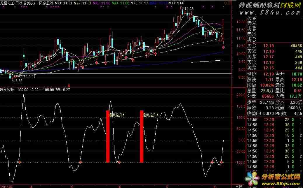 VAR1:=(HIGH+LOW+CLOSE)/3; VAR2:=(VAR1-MA(VAR1,14))/(0.015*AVEDEV(VAR1,14)); 100, POINTDOT; 0, POINTDOT; -100, POINTDOT; BB: EMA(VAR2,2); VAR3:=MA(VOL,5); VAR4:=MA(VOL,10); VAR5:=MA(VOL,60); VAR6:=MA(CLOSE,5); VAR7:=MA(CLOSE,8); VAR8:=MA(CLOSE,25); VAR9:=MA(CLOSE,60); VARA:=CROSS(VAR2,BB) AND VAR2>80 AND VOL>VAR3 AND VOL>VAR4 AND VOL>VAR5 AND VAR6>VAR9 AND VAR7>VAR9 AND VAR8>VAR9 AND OPEN<VAR6 AND CLOSE>VAR6; DRAWTEXT(VARA,120,' 爆发拉升!'), , COLORYELLOW; STICKLINE(VARA,130,-100,5,0), , COLORRED; 底部:=CROSS(BB,-100); DRAWICON(底部,-100,1); {点击看本软件截图: 58股票 公式网 http://www. 58gu. com 整理} |