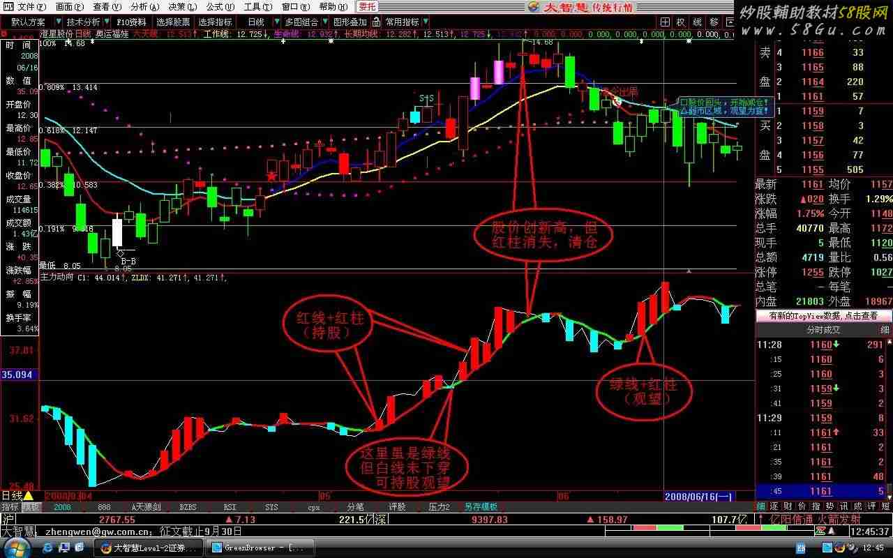 C1:10000*C/INDEXC; O1:=10000*O/INDEXO; ZLDX:MA(C1,5),COLORGREEN,LINETHICK3; STICKLINE(C1>=O1 AND C1>ZLDX,C1,ZLDX,6,0),COLORRED; STICKLINE(C1<O1 AND C1<=ZLDX ,ZLDX,C1,6,0),COLORCYAN; V1:=(2*C+H+L+O)/5; V2:=LLV(L,21); V3:=HHV(H,21); GG:= EMA((V1-V2)/(V3-V2),5); PARTLINE(GG>=REF(GG,1),ZLDX),COLORRED,LINETHICK3; 《主力动向》使用说明: 本公式简洁明快,仅包含两条波浪线(白色的C1和红绿相间的主力动向线ZLDX)和一组红蓝相间的柱线。 1、红线+红柱,持股; 红线+蓝柱,离场; 2、原则上绿线空仓: 绿线+红柱,观望; 绿线+蓝柱,离场; 但绿线向上,且白线并未下穿绿线,仍然持股; 3、股价上涨,但红柱并未随着增长,动向线由向上趋势而走平甚至向下,后市看跌; 股价创新高,而红柱消失,立即清仓; 4、股价下跌,但红柱增长,动向线由向下趋势而走平甚至向上,后市看涨; 股价创新低而蓝柱消失,立即全仓。 |