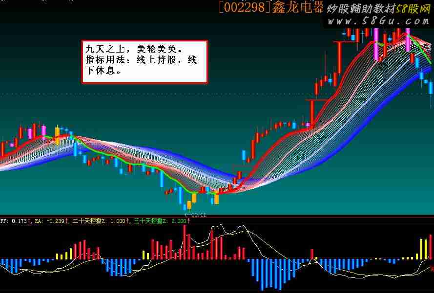 好东东要大家分享,转一主图指标。一个字,美,两个字,好美。用法见贴图。九天之上