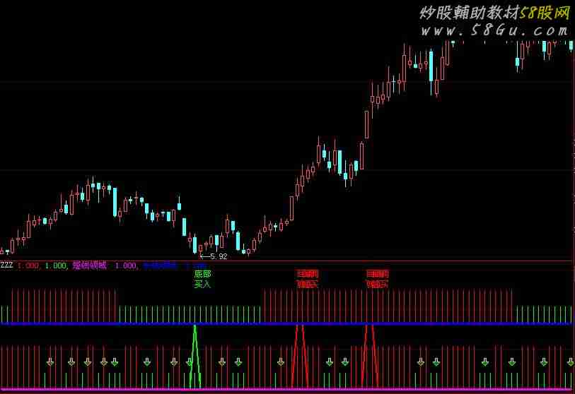 a2:=(EMA(CLOSE,3)) ; a3:=(EMA((((SLOPE(CLOSE,22))*20)+CLOSE),55)) ; a4:=MA(a3,1); STICKLINE((a2>a4),3,4,1,2),linethick1,colorRed; 短线领域:(1),linethick3,COLORMAGENTA,LAYER1; STICKLINE((a2<a4),3,3.5,1,2),linethick1,colorGreen; a5:=MA(CLOSE,1); a6:=MA(CLOSE,3); STICKLINE((a5>a6),1,2.3,1,2),linethick1,colorRed; 长线领域:(3),linethick3,COLORBLUE,LAYER1; STICKLINE((a5<=a6),1,1.5,1,2),linethick1,colorGreen; DRAWICON(((a5<=a6)AND((REF(a6,1))<(REF(a5,1)))),2,8),colorGreen; IF(((((CLOSE-(REF(CLOSE,3)))/(REF(CLOSE,3)))*100)>15),3,1),linethick2,colorRed; IF(((((CLOSE-(REF(CLOSE,3)))/(REF(CLOSE,3)))*100)<=-15),3,1),linethick2,colorGreen; DRAWTEXT(((((CLOSE-(REF(CLOSE,3)))/(REF(CLOSE,3)))*100)>15),4.6,'回调'),colorRed; DRAWTEXT(((((CLOSE-(REF(CLOSE,3)))/(REF(CLOSE,3)))*100)>15),4.3,'就买'),colorRed; DRAWTEXT(((((CLOSE-(REF(CLOSE,3)))/(REF(CLOSE,3)))*100)<-15),4.6,'底部'),colorGreen; DRAWTEXT(((((CLOSE-(REF(CLOSE,3)))/(REF(CLOSE,3)))*100)<-15),4.3,'买入'),colorGreen;