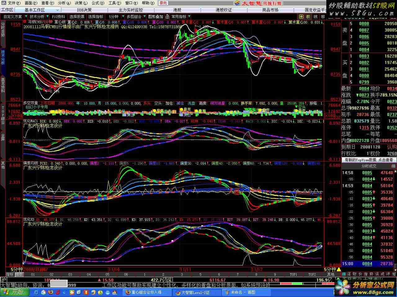 最新修订说明: 将这四个指标的短(或快)、中(或慢)、长线上的冷暖相间色进行了统一。具体说明如下: 重心组合指标无任何未来函数,请放心使用! 重心线指标系将均量与均价进行一种多时段均衡运算,然后依照MA均价系统编制而成。它由一系列短、中、长重心指标线和重心布林线组成。其中重心指标包括重心2、5、10、20和算术重心(比重心要稳定的指标,可作比重心时段长的均线)2、5、10、30、40、60、120、240、360等时段均线。在快(红绿相间的算术重心2、5、10)、中(黄青相间的算术重心30、40、60)和长线(紫蓝相间的算术重心120、240、360)上,还将上升但不下弯及上翘以暖色表达,下降但不上翘及下弯用冷色表达,并在上下轨用亮白色分别表达大小牛,用淡紫色分别表达大小熊。K 线则传承了我习惯将小牛以红色,小熊以绿色,并以空阳实阴、黄棒涨停蓝棒跌停、长白横平盘、短白横十字星表达的作法。使用原理同MA均价线一致。服从法则亦同MA均价系统。即:买进时短服从长,中长线上升,短线金叉转身向上为买进时机;卖出时长服从短,也就是不管中长线怎样走向,短线弯头向下,即为卖出时机。 由于指标线较多,顶行数据并没有全部显示其名称,可将鼠标移到该线,三秒后系统就会提示该线名称。