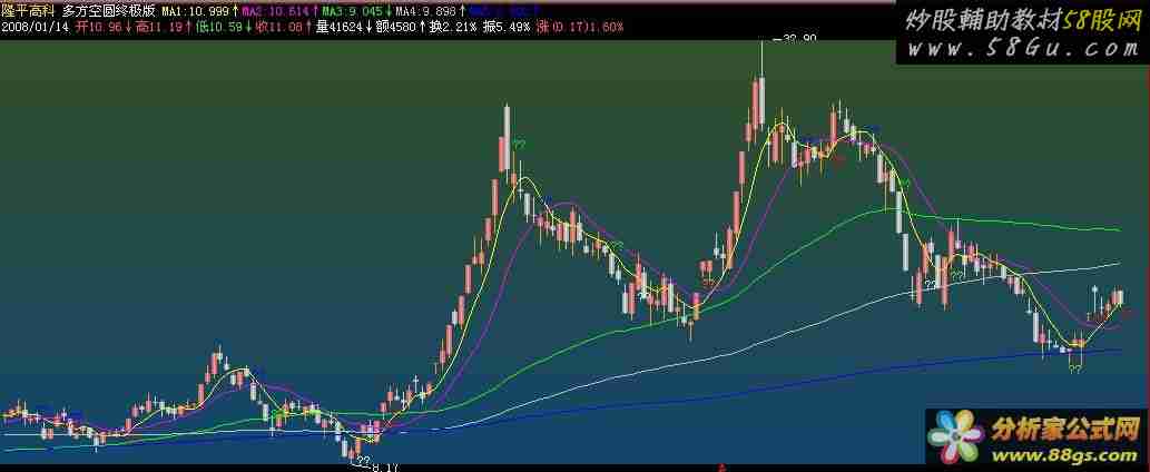 MA1:MA(CLOSE,6); MA2:MA(CLOSE,13); MA3:MA(CLOSE,62); MA4:MA(CLOSE,120); MA5:MA(CLOSE,250); X:=EMA(((SLOPE(CLOSE,21) * 20) + CLOSE),68); Y:=EMA(CLOSE,10); LL:=REF(CLOSE,2); MM:=((SMA(MAX((CLOSE - LL),0),6,1) / SMA(ABS((CLOSE - LL)),6,1)) * 100); DB:=IF(((MM < REF(MM,1)) AND (MM > 79)),MM,0); DRAWTEXT(CROSS(Y,X),(LOW * 0.985),'??'),LINETHICK2,colorred; DRAWTEXT(CROSS(X,Y),(HIGH * 1.02),'??'),LINETHICK2,color00ff00; DRAWTEXT(DB,(HIGH * 1.02),'??'),LINETHICK2,color00ff00; VAR1:=LLV(LOW,21); VAR2:=HHV(HIGH,21); AK1:=EMA((((CLOSE - VAR1) / (VAR2 - VAR1)) * 100),5); AK:=EMA((((CLOSE - VAR1) / (VAR2 - VAR1)) * 50),13); DD:=EMA(((0.667 * REF(AK1,1)) + (0.333 * AK1)),2); VAR3:=LLV(LOW,55); VAR4:=HHV(HIGH,34); VAR5:=EMA((((CLOSE - VAR3) / (VAR4 - VAR3)) * 100),3); VAR6:=((AK + VAR5) / 2); VAR7:=EMA(((0.667 * REF(VAR5,1)) + (0.333 * AK1)),2); VAR8:=EMA(VAR6,5); BB:=EMA(((0.667 * REF(VAR8,1)) + (0.333 * VAR8)),2); AB:=CROSS(AK1,AK); BB1:=(CROSS(AK1,BB) AND (BB < 30)); CD:=(BB1 * 0.6); DRAWTEXT((CD = 0.6),(LOW * 0.99),'??'),LINETHICK2,color33CC99; DRAWTEXT((AB = 1),(LOW * 0.99),'??'),LINETHICK2,colorwhite;