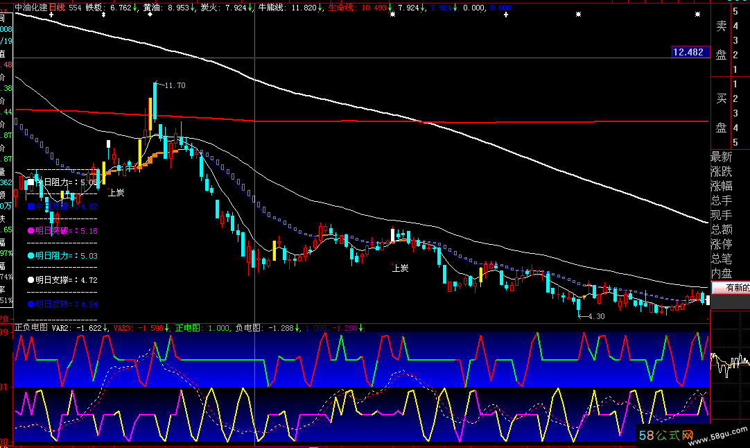 铁板:EMA(CLOSE,7),LINETHICK1,colorFFFFFF; 黄油:EMA(CLOSE,50),LINETHICK1,colorFFFFff; 炭火:EMA(CLOSE,21),colorFFffff; 牛熊线:MA(CLOSE,156),LINETHICK2,colorFFFFFF; 生命线:MA(CLOSE,453),LINETHICK2,color0000FF; PARTLINE(炭火,炭火>REF(炭火,1)),LINETHICK1,colorFFffff; PARTLINE(炭火,炭火<REF(炭火,1)),LINETHICK1,colorFF0000; AA10:=炭火; BB10:=(ATAN(AA10-REF(AA10,1)))*180/3.1416; STICKLINE(BB10>1 AND AA10>REF(AA10,1),AA10,REF(AA10,1),8,0),color0080FF; STICKLINE(BB10<1 AND AA10<REF(AA10,1),AA10,REF(AA10,1),4,1),color808080; STICKLINE(CLOSE>=OPEN,OPEN,CLOSE,6,1),color0000FF; STICKLINE(OPEN>CLOSE,CLOSE,OPEN,6,0),colorFFFF00; STICKLINE(CLOSE>=OPEN,CLOSE,HIGH,0.5,0),color0000FF; STICKLINE(CLOSE>=OPEN,OPEN,LOW,0.5,0),color0000FF; STICKLINE(OPEN>CLOSE,CLOSE,LOW,0.5,0),colorFFFF00; STICKLINE(OPEN>CLOSE,OPEN,HIGH,0.5,0),colorFFFF00; AA:=CLOSE/REF(CLOSE,1)>=1.09; STICKLINE(AA,OPEN,CLOSE,4,0),color00FFFF; STICKLINE(AA,LOW,HIGH,0.5,0),color00FFFF; A:=CROSS(铁板,炭火); STICKLINE(A,OPEN,CLOSE,6,0),LINETHICK1,colorFFFFFF; DRAWTEXT(CROSS(铁板,炭火),LOW*0.9,'上炭'),colorFFFFff; P3:=BARSTATUS=2; E:=(HIGH+LOW+OPEN+2*CLOSE)/5; 明日阻力:=2*E-LOW; 明日支撑:=2*E-HIGH; 明日突破:=E+HIGH-LOW; 明日反转:=E-(HIGH-LOW); 今日阻力:=REF(明日阻力,1); 今日支撑:=REF(明日支撑,1); DRAWTEXTREL(20,500,'-----------------'),colorFFFFFF; DRAWTEXTREL(20,580,'-----------------'),colorFFFFFF; DRAWTEXTREL(20,660,'-----------------'),colorFFFFFF; DRAWTEXTREL(20,740,'-----------------'),colorFFFFFF; DRAWTEXTREL(20,820,'-----------------'),colorFFFFFF; DRAWTEXTREL(20,900,'-----------------'),colorFFFFFF; DRAWTEXTREL(20,990,'-----------------'),colorFFFFFF; DRAWTEXTREL(20,540,'■今日阻力=:'+NUMTOSTRN(今日阻力,2)+''),colorFFffff; DRAWTEXTREL(20,620,'■今日支撑=:'+NUMTOSTRN(今日支撑,2)+''),colorFF0000; DRAWTEXTREL(20,700,'●明日突破=:'+NUMTOSTRN(明日突破,2)),colorFF00FF; DRAWTEXTREL(20,780,'●明日阻力=:'+NUMTOSTRN(明日阻力,2)),colorFFFF00; DRAWTEXTREL(20,860,'●明日支撑=:'+NUMTOSTRN(明日支撑,2)),colorFFffff; DRAWTEXTREL(20,940,'●明日反转=:'+NUMTOSTRN(明日反转,2)),colorFF0000; |