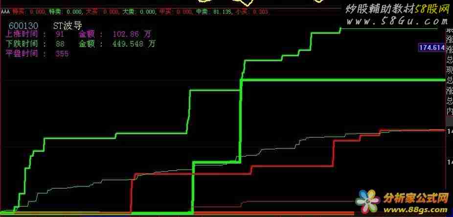 也可以引入到分时 源码 特买:"涨跌明细.特买#tick",LINETHICK7,COLORred; 特卖:"涨跌明细.特卖#tick",LINETHICK7,COLORgreen; 大买:"涨跌明细.大买#tick",LINETHICK5,COLORred; 大卖:"涨跌明细.大卖#tick",LINETHICK5,COLORgreen; 中买:"涨跌明细.中买#tick",LINETHICK3,COLORred; 中卖:"涨跌明细.中卖#tick",LINETHICK3,COLORgreen; 小买:"涨跌明细.小买#tick",LINETHICK1,COLORred; 小卖:"涨跌明细.小卖#tick",LINETHICK1,COLORgreen; 买:=特买+大买+中买+小买; 卖:=特卖+大卖+中卖+小卖; 上涨:=COUNT(c>REF(c,1),0);下跌:=COUNT(c<REF(c,1),0);平盘:=COUNT(c=REF(c,1),0); DRAWTEXTABS(10 ,30 ,'上涨时间 :'+上涨 ),COLORMAGENTA,linethick3; DRAWTEXTABS(10 ,50 ,'下跌时间 :'+下跌 ),COLORgreen,linethick3; DRAWTEXTABS(10 ,70 ,'平盘时间 :'+平盘),COLORMAGENTA,linethick3; DRAWTEXTABS(160 ,30 ,'金额 :'+买+' 万'),COLORMAGENTA,linethick3; DRAWTEXTABS(160 ,50 ,'金额 :'+卖+' 万'),COLORgreen,linethick3; |