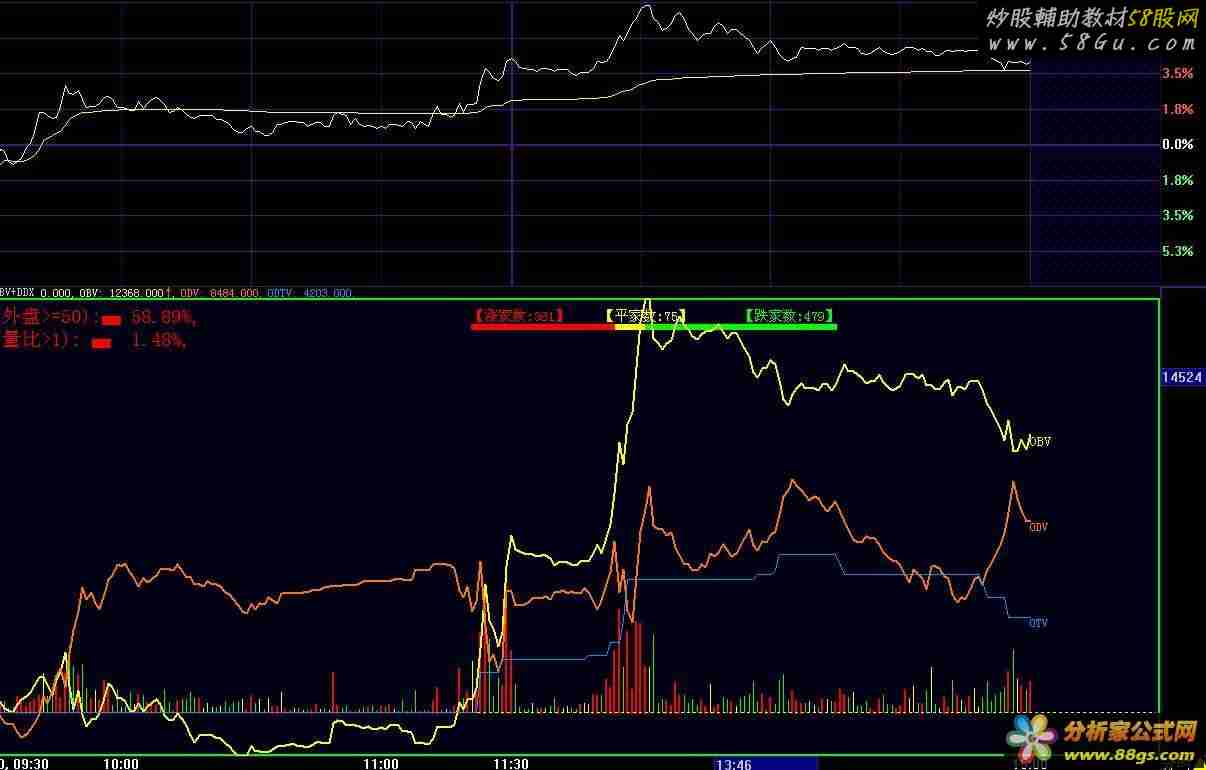 DRAWRECTREL(-1,0,1000,1000,RGB(0,0,20)),color00FF00,LINETHICK2,LAYER7;;0,DOTLINE,LAYER0; STICKLINE(C>ref(c,1),0,V*2,4,0),COLOR0000FF,linethick2; STICKLINE(C<ref(c,1),0,V*2,4,0),COLOR00FF00,linethick1; STICKLINE(C=ref(c,1),0,V*2,1,0),COLOR00FFFF,linethick1; OBV:SUM(IF(CLOSE>REF(CLOSE,1),VOL,IF(CLOSE<REF(CLOSE,1),-VOL,0)),0),color00FFff,linethick2,LAYER0;; DRAWTEXT( BARSTATUS=2,OBV ,'OBV' ),Color00ffFF,LAYER6,LINETHICK2; DDX:=(ordervol(1,2)-ordervol(2,2))/capital*100; ODV:SUM(IF(ordervol(1,2)>ordervol(2,2),VOL,IF(ordervol(1,2)<ordervol(2,2),-VOL,0)),0),color0077ff,linethick2,LAYER0;; DRAWTEXT( BARSTATUS=2,ODV ,'ODV ' ),Color0077ff,LAYER6,LINETHICK1; ODTV:SUM(IF(ordervol(1,3)>ordervol(2,3),VOL,IF(ordervol(1,3)<ordervol(2,3),-VOL,0)),0),colorff9900,linethick1,LAYER0;; DRAWTEXT( BARSTATUS=2,ODTV ,'OTV' ),Colorff9900,LAYER6,LINETHICK1; A1:=DYNAINFO(23) /(DYNAINFO(23)+ DYNAINFO(22))*100; A2:=DYNAINFO(17); DRAWTEXTABS(0,7,IFS((A1 >= 50),'(外盘>=50):▄ '+NUMTOSTRN(A1,2)+'%,','')),linethick4,color0000FF; DRAWTEXTABS(0,7,IFS((A1 < 50),'(外盘<50):▄ '+NUMTOSTRN(A1,2)+'%,','')),linethick4,color00FF00; DRAWTEXTABS(0,30,IFS((A2 >= 1), '(量比>1): ▄'+NUMTOSTRN(A2,2)+'%,','')),linethick4,color0000FF; DRAWTEXTABS(0,30,IFS((A2 < 1), '(量比<1): ▄'+NUMTOSTRN(A2,2)+'%,','')),linethick4,color00FF00; {涨跌家数} DRAWTEXTABS(480,10,'【涨家数:'+NUMTOSTRN(DYNAINFO(69),0)+ '】'),COLOR0000ff,LINETHICK2; DRAWTEXTABS(610,10,'【平家数:'+NUMTOSTRN(DYNAINFO(71),0)+ '】'),COLOR00FFff,LINETHICK2; DRAWTEXTABS(750,10,'【跌家数:'+NUMTOSTRN(DYNAINFO(70),0)+ '】'),COLOR00ff00,LINETHICK2; DRAWRECTABS(480,25 ,480+(DYNAINFO(69)+DYNAINFO(71)+DYNAINFO(70))/2.5,31, rgb(0,255,0)),COLOR00ff00,LAYER4; DRAWRECTABS(480,25 ,480+(DYNAINFO(69)+DYNAINFO(71))/2.5 ,31, rgb(255,255,0)),COLOR00FFFF,LAYER3; DRAWRECTABS(480,25 ,480+(DYNAINFO(69))/2.5 ,31, rgb(255,0,0)),COLOR0000ff,LAYER2; |