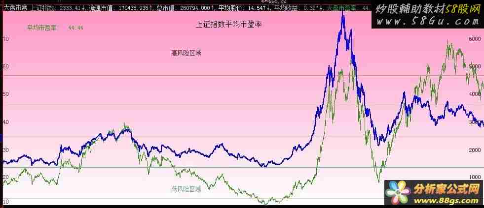 源码如下: DRAWGBKLAST(C>1,STRIP(RGB(255,150,200),RGB(255,255,255),0)); DRAWTEXTREL(400,50,'上证指数平均市盈率'),COLOR000000,LINETHICK2; DRAWTEXTREL(350,200,'高风险区域'),COLOR2D4045; DRAWTEXTREL(350,900,'低风险区域'),COLOR8EAD7A; DRAWTEXTREL(0,130,'70'),COLOR2D4045;DRAWTEXTREL(0,270,'60'),COLOR2D4045; DRAWTEXTREL(0,412,'50'),COLOR2D4045;DRAWTEXTREL(0,558,'40'),COLOR2D4045; DRAWTEXTREL(0,700,'30'),COLOR2D4045;DRAWTEXTREL(0,840,'20'),COLOR2D4045; DRAWTEXTREL(0,966,'10'),COLOR2D4045;DRAWTEXTREL(968,130,'6000'),COLOR2D4045; DRAWTEXTREL(968,270,'5000'),COLOR2D4045;DRAWTEXTREL(968,412,'4000'),COLOR2D4045; DRAWTEXTREL(968,558,'3000'),COLOR2D4045;DRAWTEXTREL(968,700,'2000'),COLOR2D4045; DRAWTEXTREL(968,840,'1000'),COLOR2D4045;DRAWTEXTREL(968,966,'0'),COLOR2D4045; POLYLINE(C,10),COLOR9BBECC;POLYLINE(C,20),COLOR8EAD7A,LINETHICK2; POLYLINE(C,30),COLOR9BBECC;POLYLINE(C,40),COLOR9BBECC; POLYLINE(C,50),COLOR798FC3,LINETHICK2;POLYLINE(C,60),COLOR9BBECC; POLYLINE(C,70),COLOR9BBECC; 上证指数:INDEXC,COLOR8BA68C,LINETHICK0,PRECIS2; POLYLINE(C,C/100+10),COLORff0000,LINETHICK2; 流通市值:selfdata('流通市值'),linethick0; 总市值:selfdata('总市值'),linethick0; 平均股价:selfdata('平均股价'),linethick0; 平均收益:selfdata('平均收益'),linethick0; 大盘市盈率:平均股价/平均收益,linethick1 ,color199633; DRAWTEXTREL(50,70,'平均市盈率: '+NUMTOSTRN(大盘市盈率,2)),COLOR199633;