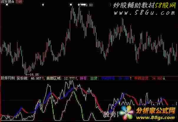 实价线:(C-LLV(L,60))/(HHV(H,60)-LLV(L,60))*100,COLORWHITE; A1:=(2*C+H+L)/4; A2:=LLV(L,34); A3:=HHV(H,34); A4:=SMA((HHV(H,9)-C)/(HHV(H,9)-LLV(LOW,9))*100-70,9,1)+100; A5:=(C-LLV(L,9))/(HHV(H,9)- LLV(L,9))*100; A6:=SMA(SMA(A5,3,1),3,1)+100; A7:=A6-A4; 底部区域:IF(A7>60,A7-60,0),COLORYELLOW; 持有:STICKLINE(REF(底部区域,1)<底部区域,底部区域,REF(底部区域,1),5,0),COLORF00FF0; 出货:STICKLINE(REF(底部区域,1)>底部区域,底部区域,REF(底部区域,1),5,0),COLOR00FF00;