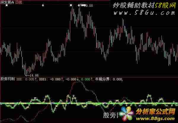 DDX1:sma(DX,3,1)*10,COLORyellow; {变色} if(DDX1>ref(DDX1,1),DDX1,0),Circledot,COLORYELLOW,LINETHICK1; if(DDX1<ref(DDX1,1),DDX1,0),Circledot,COLOR00FF00,LINETHICK1; {只做红波段} VAR1:=EMA(CLOSE,13)-EMA(CLOSE,55); VAR2:=EMA(VAR1,3); VAR3:=VAR1>VAR2; VAR4:=VAR1<VAR2; 牛熊分界:0,COLORwhite,LINETHICK2,POINTDOT; STICKLINE(VAR3,VAR1,VAR2,4,0),COLORRED; STICKLINE(VAR4,VAR1,VAR2,2,0),COLORGREEN; |