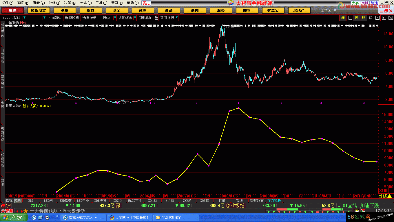指标的优点是把股东人数和K线对应上了。缺点是每季度一个数据。 {股东人数} 股东人数:PFFIN(4253,0),Color00FFFF,LINETHICK0,PRECIS0; 股东人数1:=PFFININ(4253,2010,0331); aa:=FILTER(if(股东人数>0,1,0),10000); cc:=if(BARSTATUS=2,1,0); bb:=if(股东人数<>ref(股东人数,1) or aa or cc,股东人数,1); POLYLINE(bb=股东人数,股东人数),Color00FFFF,LINETHICK2; STICKLINE(bb=股东人数,股东人数,股东人数,0.1,0),LINETHICK6,ColorFF00FF;