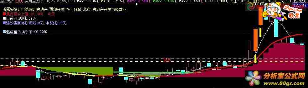 使用方法供参考: 当主图中为乳红色区域为可操作区域,股价在日线图/60分钟图中外于长压和超长压下方并横盘整理(长压线与超长压线越靠近越好),在60分钟图中出股价突破长压或超长压线(长压线与超长压线越靠近越好)/RSI大于8.0(同时日线图中RSI大于6.8),些时的个股会进了主升当浪(几天的涨幅 ) 自编主图源码:参数设置(P1,5,0,999,1),其他替换5就OK. MA5:MA(CLOSE,P1),COLORWHITE,linethick1; MA10:MA(CLOSE,P2),linethick0; MA25:MA(CLOSE,P3),linethick1; MA45:MA(CLOSE,P4),linethick2; MA55:MA(CLOSE,P5),linethick0;高1:=REF(HHV(H,120),3); 低1:=REF(LLV(L,120),3);H1:=高1-(高1-低1)*0.191; H2:=高1-(高1-低1)*0.382; H3:=高1-(高1-低1)*0.5; H4:=高1-(高1-低1)*0.618; H5:=高1-(高1-低1)*0.809;突破:=REF(EMA(C,14),1); A1X:=(EMA(C,10)-突破)/突破*100;基准:=IF(A1X>=0,REF(EMA(C,10),BARSLAST(CROSS(A1X,0))+1),REF(EMA(C,10),BARSLAST(CROSS(0,A1X))+1)); { stickline(A1X>=0,突破,突破,10,0),coloryellow; stickline(A1X<0,突破,ref(突破,1),0,-1000); } STICKLINE(A1X>=0,基准,突破,10,0),COLOR330099; STICKLINE(A1X<0,基准,突破,10,0),COLOR009966; Var326:=IF(CLOSE>REF(CLOSE,1),88,0); Var327:=IF(CLOSE/REF(CLOSE,1)>1.050 AND HIGH/CLOSE<1.010 AND Var326>0, 91, 0); STICKLINE(Var327>90,L*0.99,L*0.95,4,0),COLORYELLOW; TY:=C; AA1:=REF(TY,5)=HHV(TY,2*5+1); B1:=FILTER(AA1,5); C1:=BACKSET(B1,5+1); HD:=FILTER(C1,5); AA2:=REF(TY,9)=LLV(TY,2*9+1); B2:=FILTER(AA2,9); C2:=BACKSET(B2,9+1); LD:=FILTER(C2,9); AA3:=REF(TY,10)=HHV(TY,2*10+1); B3:=FILTER(AA3,10); C3:=BACKSET(B3,10+1); HD1:=FILTER(C3,10); AA4:=REF(TY,60)=HHV(TY,2*60+1); B4:=FILTER(AA4,60); C4:=BACKSET(B4,60+1); HD2:=FILTER(C4,60); 长压:REF(C,BARSLAST(HD1)),COLORYELLOW{红色},POINTDOT; STICKLINE(C,长压,长压,6,2),COLORYELLOW,linethick2; 超长压:REF(C,BARSLAST(HD2)),COLORYELLOW{红色},POINTDOT; STICKLINE(C,超长压,超长压,6,2),COLORWHITE,linethick1; 天1:COST(99),POINTDOT,COLORWHITE,LINETHICK0; 现价:C*1.03,LINETHICK0; A2: MA10; PARTLINE(A2,A2>REF(A2,1),RGB(255,0,0),A2<REF(A2,1),RGB(250,250,0)),linethick3; W:=BARSLAST(DISPSTATUS=1); 天:BARSLAST(L=LLV(LOW,W)),COLOR00FFFF,LINETHICK0,PRECIS0; DRAWTEXTREL(10,150,'■目前可见K线:'+NUMTOSTRN(W+1,0)+'天'),colorwhite; 低涨:(C/LLV(LOW,W)-1)*100,COLOR0000FF,LINETHICK0,PRECIS2;DRAWTEXTREL(10,100,'■低点至今上涨:'+NUMTOSTRN(低涨,2)+'% '+NUMTOSTRN(天,0)+'天'),COLOR0000FF; DRAWTEXTREL(10,200,'■建议查阅K线:短线30天,中长线120天!'),COLORFF8899; BEGIN DRAWTEXTREL(10,50,'所属板块:'+BKNAME),LINETHICK1,color00FFFF;end; ZT:=C/REF(C,1)>1.097; XH:=FILTER(ZT,13); BH:=BARSLAST(ZT); CZ:=REF(H,BH)-REF(L,BH); STICKLINE(ZT,REF(O,BH),REF(C,BH),7,0),COLOR0066FF; N:=REF("MACD.DIFF#WEEK",1)<0 AND "MACD.DIFF#WEEK">=0;{信号点} AC:=BARSLAST(N); HSL:100*VOL/CAPITAL,LINETHICK0; HS100:=CROSS(SUM(HSL,AC)>=100,0.1) AND AC>0; HS200:=CROSS(SUM(HSL,AC)>=200,0.1) AND AC>0; HS300:=CROSS(SUM(HSL,AC)>=300,0.1) AND AC>0; HS400:=CROSS(SUM(HSL,AC)>=400,0.1) AND AC>0; HS500:=CROSS(SUM(HSL,AC)>=500,0.1) AND AC>0; HS600:=CROSS(SUM(HSL,AC)>=600,0.1) AND AC>0; HS700:=CROSS(SUM(HSL,AC)>=700,0.1) AND AC>0; HS800:=CROSS(SUM(HSL,AC)>=800,0.1) AND AC>0; HS900:=CROSS(SUM(HSL,AC)>=900,0.1) AND AC>0; HS1000:=CROSS(SUM(HSL,AC)>=1000,0.1) AND AC>0; DRAWTEXT(N,H*1.06,'起点'),COLORRED,ALIGN1; TZHSL:=SUM(HSL,AC); DRAWTEXTREL(10,300,'■起点至今换手率:'+NUMTOSTRN(TZHSL,2)+'% '),COLORFFCC99; DRAWTEXT(HS100,H*1.06,'100%'),ALIGN1,COLORCYAN; DRAWTEXT(HS200,H*1.06,'200%'),ALIGN1,COLORGREEN; DRAWTEXT(HS300,H*1.06,'300%'),ALIGN1,COLORYELLOW; DRAWTEXT(HS400,H*1.06,'400%'),ALIGN1,COLORFF00FF; DRAWTEXT(HS500,H*1.06,'500%'),ALIGN1,COLORRED; DRAWTEXT(HS600,H*1.06,'600%'),ALIGN1,COLORYELLOW; DRAWTEXT(HS700,H*1.06,'700%'),ALIGN1,COLORFF00FF; DRAWTEXT(HS800,H*1.06,'800%'),ALIGN1,COLORGREEN; DRAWTEXT(HS900,H*1.06,'900%'),ALIGN1,COLORCYAN; DRAWTEXT(HS1000,H*1.06,'1000%'),ALIGN1,COLORFFFFFF;自用附图源码: 优化RSI N:=5; M:=10; LC:=REF((O+H+L+2*C)/5,1); RSI:SMA(MAX(C-LC,0),N,1)/SMA(ABS(C-LC),N,1)*10; 关注M顶:RSI,COLORWHITE,LINETHICK0; 安全度:SMA(MAX(C-LC,0),M,1)/SMA(ABS(C-LC),M,1)*10,COLORFF00FF; 超买:8,COLORRED,POINTDOT; 牛市:7.1,COLOR00FFFF; 平衡:5,COLORWHITE,POINTDOT; 熊市:2.5,COLORCYAN; 超卖:2,COLOR00FF00,POINTDOT; PARTLINE(RSI,RSI>8,RGB(255,0,0),RSI<=2,RGB(241,225,22)); PARTLINE(安全度,安全度>8,RGB(255,0,0),安全度<=2,RGB(0,255,0));一阳穿三线 input:N(6,5,120); MA30:EMA(C,30),linethick0; BDGD:=C=HHV(C,N); BDDD:=C=LLV(C,N); N1:=BARSLAST(BDGD); N2:=BARSLAST(BDDD); 高:IF(N1,REF(C,N1),REF(C,N1)),linethick0; 低:IF(N2,REF(C,N2),REF(C,N2)),linethick0; 箱高:(高/低-1),linethick0; FLSZ:=C/REF(C,1)>=1.01 AND V>REF(V,1); GDGD:=高>REF(高,1) AND REF(高,1)<=REF(高,2); TP:=COUNT(GDGD,2) AND COUNT(FLSZ,2); 突破:FILTER(TP,1)*2.5,COLORRED,linethick2; 启动:C>低 AND REF(C=低,1),linethick0; 小心:C<高 AND REF(C=高,1),linethick0; MA5:=EMA(C,5); MA10:=EMA(C,10); MA20:=EMA(C,20); MA30:=EMA(C,30); MA60:=EMA(C,60); YCX:=MA5>=REF(MA5,1); H1:=MAX(MAX(MA5,MA10),MA20); L1:=MIN(MIN(MA5,MA10),MA20); 一阳穿三线:(H1<C AND O<L1 AND YCX AND MA30>REF(MA20,1))*1,linethick3;
