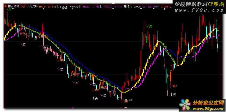 MA13:MA(C,13),COLOR0066FF,LINETHICK2; STICKLINE(C>MA13,L,H,0,0),COLORRED; STICKLINE(C>MA13,O,C,8,0),COLOR000088; STICKLINE(C>MA13,O,C,5,0),COLOR0000AA; STICKLINE(C>MA13,O,C,3,0),COLOR0000CC; STICKLINE(C>MA13,O,C,1,0),COLOR0000FF; BIAS1:MA((C-MA(C,13))/MA(C,13),3)*100,COLORWHITE,LINETHICK0; BIAS3:MA((C-MA(C,34))/MA(C,34),3)*100,COLORFF00FF,LINETHICK0; 关注区:COUNT(BIAS3<0,8)>=8 AND COUNT(BIAS3>0,34)>13 AND COUNT(BIAS3<0,55)>30 OR BIAS3<-15,LINETHICK0; STICKLINE(关注区,C,O,8,0),COLOR8977FF; STICKLINE(关注区,L,H,0,0),COLOR8977FF; 开炮1:CROSS(BIAS1,0) AND SUM(IF(BIAS3<-15,10,0),8)>10,LINETHICK0; STICKLINE(开炮1,C,O,8,0),COLOR0066BB; STICKLINE(开炮1,C,O,5,0),COLOR0099CC; STICKLINE(开炮1,C,O,3,0),COLOR00CCEE; STICKLINE(开炮1,C,O,1,0),COLOR00FFFF; STICKLINE(开炮1,L,H,0,0),COLOR00FFFF; DRAWTEXT(开炮1,C*0.97,'开炮1'),COLOR0000FF; LC:REF(C,1),LINETHICK0; RSI:=((SMA(MAX((C-LC),0),13,1)/SMA(ABS((C-LC)),13,1))*100); STICKLINE((RSI<20),L,H,0.1,0),COLORFF6600; STICKLINE((RSI<20),O,C,8,0),COLORCC5000; DRAWTEXT(CROSS(RSI,20-0.0005),L*0.97,'短线'),COLORAA99AA; STICKLINE(CROSS(RSI,20-0.0005),C,O,8,0),COLOR888888; STICKLINE(CROSS(RSI,20-0.0005),C,O,5,0),COLORAAAAAA; STICKLINE(CROSS(RSI,20-0.0005),C,O,3,0),COLORCCCCCC; STICKLINE(CROSS(RSI,20-0.0005),C,O,1,0),COLORFFFFFF; STICKLINE(CROSS(RSI,20-0.0005),L,H,0,0),COLORFFFFFF; RSV:=(((C-LLV(L,9))/(HHV(H,9)-LLV(L,9)))*100); K:=SMA(RSV,3,1); D:=SMA(K,3,1); NB:=((C>LC) AND ISUP); KK:=HHV(K,5); DD:=HHV(D,5); D1:=REF(D,1); K1:=REF(K,1); STICKLINE(((DD>75) AND CROSS(D,K)),C,O,8,0),COLOR008800; STICKLINE(((DD>75) AND CROSS(D,K)),C,O,5,0),COLOR00AA00; STICKLINE(((DD>75) AND CROSS(D,K)),C,O,3,0),COLOR00CC00; STICKLINE(((DD>75) AND CROSS(D,K)),C,O,1,0),COLOR00FF00; STICKLINE(((DD>75) AND CROSS(D,K)),L,H,0,0),COLOR00FF00; STICKLINE((((D1<30) AND CROSS(K,D)) AND NB),C,O,8,0),COLOR0011FF; STICKLINE((((D1<30) AND CROSS(K,D)) AND NB),C,O,5,0),COLOR0044FF; STICKLINE((((D1<30) AND CROSS(K,D)) AND NB),C,O,3,0),COLOR0077FF; STICKLINE((((D1<30) AND CROSS(K,D)) AND NB),C,O,1,0),COLOR0099FF; STICKLINE((((D1<30) AND CROSS(K,D)) AND NB),L,H,0,0),COLOR0099FF; DRAWTEXT((((D1<30) AND CROSS(K,D)) AND NB),L,'开炮2'),COLOR0066FF; DRAWTEXT((((D1<30) AND CROSS(K,D)) AND NB),L*0.95,'↑买'),COLORFFAAFF; DRAWTEXT(((DD>75) AND CROSS(D,K)),H*1.05,'↓卖'),COLOR00CC00; QN1:=MA(C,13); QN:=ATAN((QN1-REF(QN1,1)))*180/2; STICKLINE(QN>1 AND QN1>REF(QN1,1),QN1,REF(QN1,1),8,0),COLOR00FFFF; STICKLINE(QN<1 AND QN1<REF(QN1,1),QN1,REF(QN1,1),8,1),COLORGREEN; QN2:=MA(C,21); QN3:=ATAN((QN2-REF(QN2,1)))*180/2; STICKLINE(QN3>1,QN2,REF(QN2,1),8,0),COLORFF00FF; STICKLINE(QN3<1,QN2,REF(QN2,1),8,1),COLORFF0000;使用说明: 一.【设计原理】 投资这点事与其说是与天为敌,不如说与人性为敌来得更加贴切!毕竟对你来说“买”、“买”二动作都没有人拿枪指着你。所以,股市中最危险的是人,而最难征服的对手就是你自己。“小忍成精,大忍成佛”!老巴(巴菲特)先生曾说过:等待是一种艺术,而耐心则是一种能够让你赚钱的美德。 二.【适用范围】 适用于判断短线趋势,并指导波段操作。 三.【使用方法】 1.当指标发出“开炮2”或“↑买”信号,股价一路上涨;在股价下跌之前的顶部,它能准确发出“↓卖”信号,提示朋友们立即规避风险。 2.当指标出现粉红区域盘整时,可以密切关注或逐步建仓。一旦出现浅黄金柱和“开炮1”则说明底部盘整结束,短线第一时间买入机会出现。 3.该指标中含有二个趋势带:短线趋势带与长线趋势带。 (A.)当短线趋势带由黄转绿,表示多头转空头;反之,表示空头转多头。 (B.)当长线趋势带由粉红转蓝时,表示多头转空头;反之,表示空头转多头。 (C.)当二趋势带发生金叉,表示多头开始;反之,空头开始。 4.本指标无未来函数,如能与其它副图配合使用更能提高命中率。 |