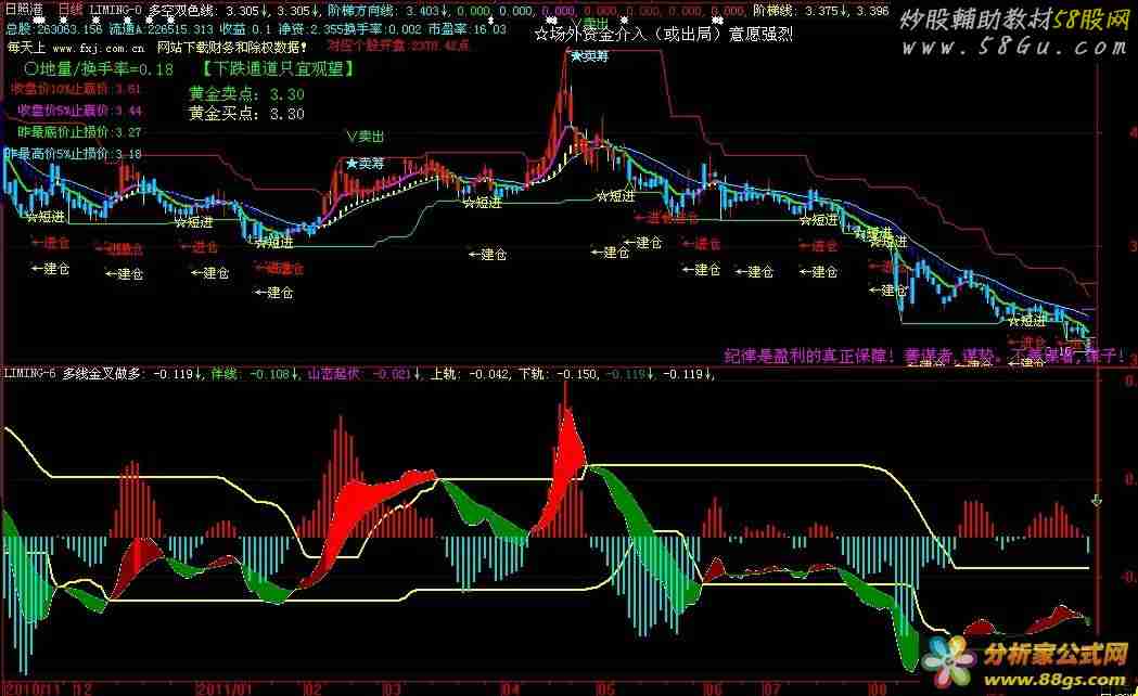 多线金叉做多: EMA(CLOSE,9) - EMA(CLOSE,26),COLORWHITE; 伴线: EMA(多线金叉做多,12),COLORGREEN; 起伏:2*(多线金叉做多-伴线),COLORSTICK; STICKLINE(起伏>0,起伏, 0, 5, 1),Color0000ff; STICKLINE(起伏<0,起伏, 0, 5, 1),Colordddd00; DRAWICON(BARSTATUS=2 AND 起伏>REF(起伏,1),HHV(起伏,35), 7),VALIGN2; DRAWICON(BARSTATUS=2 AND 起伏<REF(起伏,1),HHV(起伏,35), 8),VALIGN1; VAR1:=HHV(伴线,53); VAR2:=LLV(伴线,55); VAR3:=伴线-(多线金叉做多-伴线); 上轨:IF(多线金叉做多>VAR1 AND 伴线=VAR1,MAX(LLV(VAR1,10),VAR3),VAR1),COLORYELLOW,LINETHICK2; 下轨:IF(多线金叉做多<VAR2 AND 伴线=VAR2,MIN(HHV(VAR2,10),VAR3),VAR2),COLORYELLOW,LINETHICK2; 主升:= 多线金叉做多>0 AND 多线金叉做多>伴线; FILLRGN(多线金叉做多,伴线,多线金叉做多>伴线,RGB(130,0,0),多线金叉做多<伴线,RGB(0,130,0)); FILLRGN(多线金叉做多,伴线,主升,RGB(250,0,0)); |