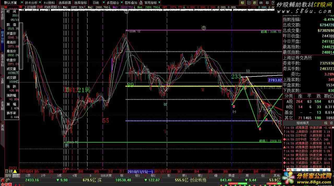 说明: 这个公式都是取自于坛子里各位老师源码,我只是把它们集中在了一起而已。 这个公式是大智慧可用,其他软件没有做测试,不知道能不能通过。 这个公式包含了一下内容: 1、斐波那契自动画线系统,用来看时间周期; 2、数浪画线系统,用来看波浪周期; 3、均线周期系统,可以在分时线到年线自动调节均线的状态; 默认分时线、1分钟线、日线、月线的均线排列是5,10,20,30; 5分钟是15,30,60;15分钟是4,12,24;30分钟是5,10,30,60;60分钟线是5,10,20,60;周线是5,10,20; 如果有其他需求可以自己在源码里改动就行; 4、立桩量系统,用来测定该股的爆发能力。如果大家觉得好用的话,那就把多顶一顶,让有需要的人都能够用到!具体参数设置如图所示。源码如下: {DATATYPE,返回数据类型,设置对照表 分时线=1,分笔成交=2,1分钟线=3,5分钟线=4,15分钟线=5,30分钟线=6,60分钟线=7,日线=8,周线=9,月线=10,多日线=11,年线=12,季线=13,半年线=14。-----------根据各周期所需均线参数自由设定.}p1:=if(DATATYPE=1,5,if(DATATYPE=2,1,if(DATATYPE=3,5,if(DATATYPE=4,15,if(DATATYPE=5,4,if(DATATYPE=6,5,if(DATATYPE=7,5,if(DATATYPE=8,5,if(DATATYPE=9,5,if(DATATYPE=10,5,20)))))))))); p2:=if(DATATYPE=1,10,if(DATATYPE=2,1,if(DATATYPE=3,10,if(DATATYPE=4,30,if(DATATYPE=5,12,if(DATATYPE=6,10,if(DATATYPE=7,10,if(DATATYPE=8,10,if(DATATYPE=9,10,if(DATATYPE=10,10,20)))))))))); p3:=if(DATATYPE=1,20,if(DATATYPE=2,1,if(DATATYPE=3,20,if(DATATYPE=4,60,if(DATATYPE=5,24,if(DATATYPE=6,30,if(DATATYPE=7,20,if(DATATYPE=8,20,if(DATATYPE=9,20,if(DATATYPE=10,20,20)))))))))); p4:=if(DATATYPE=1,30,if(DATATYPE=2,1,if(DATATYPE=3,30,if(DATATYPE=4,60,if(DATATYPE=5,24,if(DATATYPE=6,60,if(DATATYPE=7,60,if(DATATYPE=8,30,if(DATATYPE=9,20,if(DATATYPE=10,30,20))))))))));MA1:MA(CLOSE,P1); MA2:MA(CLOSE,P2); MA3:MA(CLOSE,P3); MA4:MA(CLOSE,P4); GET:ZIG(3,5),colorred;PL5:=ZIG(3,5);EN1:=pl5>REF(pl5,1) AND REF(pl5,1)<=REF(pl5,2) AND REF(pl5,2)<=REF(pl5,3);EX1:=pl5<REF(pl5,1) AND REF(pl5,1)>=REF(pl5,2) AND REF(pl5,2)>=REF(pl5,3);PL10:=ZIG(3,10);EN2:=pl10>REF(pl10,1) AND REF(pl10,1)<=REF(pl10,2) AND REF(pl10,2)<=REF(pl10,3);EX2:=pl10<REF(pl10,1) AND REF(pl10,1)>=REF(pl10,2) AND REF(pl10,2)>=REF(pl10,3);PL20:=ZIG(3,20);EN3:=pl20>REF(pl20,1) AND REF(pl20,1)<=REF(pl20,2) AND REF(pl20,2)<=REF(pl20,3);EX3:=pl20<REF(pl20,1) AND REF(pl20,1)>=REF(pl20,2) AND REF(pl20,2)>=REF(pl20,3);走强1:=BARSLAST(PL5<REF(PL5,1));走弱1:=BARSLAST(PL5>REF(PL5,1));走强2:=BARSLAST(PL10<REF(PL10,1));走弱2:=BARSLAST(PL10>REF(PL10,1));走强3:=BARSLAST(PL20<REF(PL20,1));走弱3:=BARSLAST(PL20>REF(PL20,1));ZTJZ5:=IF(PL10>REF(PL10,1),COUNT(EN1,走强2),0);ZTJD5:=IF(PL10>REF(PL10,1),COUNT(EX1,走强2),0);DTJZ5:=IF(PL10<REF(PL10,1),COUNT(EN1,走弱2),0);DTJD5:=IF(PL10<REF(PL10,1),COUNT(EX1,走弱2),0);ZTJZ10:=IF(PL20>REF(PL20,1),COUNT(EN2,走强3),0);ZTJD10:=IF(PL20>REF(PL20,1),COUNT(EX2,走强3),0);DTJZ10:=IF(PL20<REF(PL20,1),COUNT(EN2,走弱3),0);DTJD10:=IF(PL20<REF(PL20,1),COUNT(EX2,走弱3),0);DRAWTEXT(EN1 AND DTJZ5=1,L*0.98,'㈠'),COLORFFFF00;DRAWTEXT(EX1 AND DTJD5=2,H*1.02,'㈡'),COLORFFFF00;DRAWTEXT(EN2 AND ZTJZ5=1,L*0.98,'㈢'),COLORFFFF00;DRAWTEXT(EX1 AND PL10>REF(PL10,1) AND ZTJD5=1,H*1.02,'⑴'),COLOR0000FF;DRAWTEXT(EN1 AND PL10>REF(PL10,1) AND ZTJZ5=2,L*0.98,'⑵'),COLOR0000FF;DRAWTEXT(EX1 AND PL10>REF(PL10,1) AND ZTJZ5=2,H*1.02,'⑶'),COLOR0000FF;DRAWTEXT(EN1 AND PL10>REF(PL10,1) AND ZTJZ5=3,L*0.98,'⑷'),COLOR0000FF;DRAWTEXT(EX2 AND PL20>REF(PL20,1) AND ZTJD10=1,H*1.02,'⑸'),COLOR0000FF;DRAWTEXT(EN2 AND DTJZ10=1,L*0.9,'Ⅰ'),colorred;DRAWTEXT(EX2 AND DTJD10=2,H*0.9,'Ⅱ'),colorred;DRAWTEXT(EN3 AND ZTJZ10=1,L*0.9,'Ⅲ'),colorred;DRAWTEXT(EX2 AND PL20>REF(PL20,1) AND ZTJD10=1,H*1.06,'①'),LINETHICK3,COLOR00FFFF;DRAWTEXT(EN2 AND PL20>REF(PL20,1) AND ZTJZ10=2,L*0.94,'②'),LINETHICK3,COLOR00FFFF;DRAWTEXT(EX2 AND PL20>REF(PL20,1) AND ZTJD10=2 OR (ZTJD10=0 OR ZTJD10=2) AND EX2,H*1.06,'③'),LINETHICK3,COLOR00FFFF;DRAWTEXT(EN3 AND ZTJZ10=1,L*0.9,'Ⅲ'),colorred; zz:=(o+h+l)/3;N:=20; STICKLINE(C>=O,C,O,8,0),COLOR000055; STICKLINE(C>=O,C,O,6.5,0),COLOR000075; STICKLINE(C>=O,C,O,5,0),COLOR000095; STICKLINE(C>=O,C,O,3.5,0),COLOR0000B5; STICKLINE(C>=O,C,O,2,0),COLOR0000D5; STICKLINE(C>=O,H,L,0.5,0),COLOR0000F5; STICKLINE(C<O,C,O,8,0),COLOR303000; STICKLINE(C<O,C,O,6.5,0),COLOR404000; STICKLINE(C<O,C,O,5,0),COLOR505000; STICKLINE(C<O,C,O,3.5,0),COLOR606000; STICKLINE(C<O,C,O,2,0),COLOR707000; STICKLINE(C<O,H,L,0.5,0),COLOR808000;均价:=(3*C+H+L+O)/6; VAR1:=(8*均价+7*REF(均价,1)+6*REF(均价,2)+5*REF(均价,3)+4*REF(均价,4)+3*REF(均价,5)+2*REF(均价,6)+REF(均价,8))/36; VAR2:=(LLV(VAR1,2)+LLV(VAR1,4)+LLV(VAR1,6))/3; SZ1:=REF(VAR1,1)=REF(VAR2,1) AND VAR1>VAR2 AND CLOSE>VAR1; SZ2:=VAR1>VAR2 AND VAR1>REF(VAR1,1) AND VAR2>REF(VAR2,1) AND H/VAR1<1.1 AND L>VAR2 AND CLOSE>VAR1; SZ3:=VAR1>VAR2 AND VAR1>REF(VAR1,1) AND VAR2>=REF(VAR2,1) AND H/VAR1>1.1; SZ4:=VAR1>VAR2 AND VAR1>REF(VAR1,1) AND VAR2>REF(VAR2,1) AND CLOSE>VAR2 AND CLOSE<VAR1; SZ5:=(VAR1>VAR2 AND VAR2>REF(VAR2,1) AND VAR1<>REF(VAR1,1) AND CLOSE<VAR2) OR (VAR1>VAR2 AND VAR1<REF(VAR1,1) AND VAR2<REF(VAR2,1) AND CLOSE<VAR2);; SZ6:=REF(VAR1,1)>REF(VAR2,1) AND VAR1=VAR2 AND CLOSE<VAR2; XD1:=VAR1=VAR2 AND CLOSE<VAR2 OR (VAR1<REF(VAR1,1) AND VAR2<REF(VAR2,1) AND REF(VAR1,1)=REF(VAR2,1) AND CLOSE<VAR2); XD2:=VAR1=VAR2 AND CLOSE>VAR1; SAT:=(AMOUNT/C)/(HHV(AMOUNT,N)/HHV(C,N)); TJ1:=VOL=HHV(VOL,10) AND VOL>2*REF(VOL,1) AND CLOSE>VAR1; 立桩量:=FILTER(TJ1,5); TJ2:=IF(BARSLAST(立桩量)=1 AND CLOSE>REF(HIGH,1),1,IF(BARSLAST(立桩量)=2 AND CLOSE>REF(HIGH,2),1,IF(BARSLAST(立桩量)=3 AND CLOSE>REF(HIGH,3),1,0))); 突破:=TJ2=1; STICKLINE(CLOSE,REF(HIGH,BARSLAST(立桩量)),REF(HIGH,BARSLAST(立桩量)),6,0),COLORCYAN; STICKLINE(CLOSE,REF(LOW,BARSLAST(立桩量)),REF(LOW,BARSLAST(立桩量)),6,0),COLORYELLOW; TJ3:=IF(BARSLAST(立桩量)=1 AND CLOSE>REF(LOW,1),1,IF(BARSLAST(立桩量)=2 AND CLOSE>REF(LOW,2),1,I