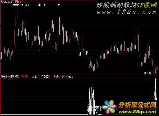 input:N(5,1,100); 幅度:=ABS((C-REF(C,1))/REF(C,1)); 转折:=IF(C>=O,幅度,0-幅度); 变异速度:=转折*1000000/INDEXC; 平安:SUM(变异速度,n),linethick2,COLORRED; 大运:SUM(0-变异速度,n),linethick2,coloryellow; LC:=REF(CLOSE,1); DIFF:= EMA(CLOSE,12) - EMA(CLOSE,26); DEA:= EMA(DIFF,9); MACD:= 2*(DIFF-DEA); 容量比率:=SUM(IF(CLOSE>LC,VOL,0),26)*100/SUM(IF(CLOSE<=LC,VOL,0),26); 和谐:(容量比率<70 OR CROSS(DIFF,DEA)) AND CROSS(平安,大运) AND C/L>1.02,linethick2,colorwhite; DRAWICON(和谐,0,7);