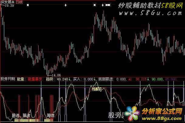 Var12:=(趋势线-REF(趋势线,1))/REF(趋势线,1)*100; 能量:STICKLINE(趋势线<=13,0,6,8,0),COLORYELLOW; 能量暴发:STICKLINE(趋势线<=13 AND Var12>13,0,65,1,0),colorred; 趋势:3*SMA((CLOSE-LLV(LOW,27))/(HHV(HIGH,27)-LLV(LOW,27))*100,5,1)-2*SMA(SMA((CLOSE-LLV (LOW,27))/(HHV(HIGH,27)-LLV(LOW,27))*100,5,1),3,1),coloryellow; 买入: IF(CROSS(趋势,50),100,0),colorffcccc; 底部跟进:cross(趋势,7); DRAWTEXT(cross(趋势,7)and cross(趋势,7)=1,20,'跟进'),colorwhite; A1:3*SMA((C-LLV(L,55))/(HHV(H,55)-LLV(L,55))*100,5,1)-2*SMA((C-LLV(L,55))/(HHV(H,55)-LLV (L,55))*100,5,1),colorred; 90,colorgreen; 85; DRAWTEXT(FILTER(A1>85,15)=1,85,'逃顶'),coloryellow; DRAWTEXT(FILTER(A1>80,15)=1,85,'逃顶'),coloryellow; |