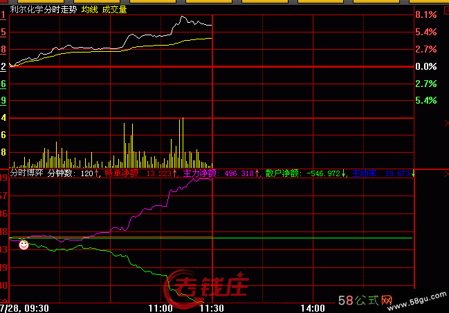 分时副图-分时博弈分钟数:IF(TIME0/60-570<=130,TIME0/60-570,TIME0/60-660),PRECIS0,linethick0; 总成交量:=SUM(VOL,分钟数+1)/100; 总成交额:=SUM(AMOUNT,分钟数+1)/10000; {逐笔总量:=SUM(ordervol(1,0)-ordervol(2,0),分钟数)/100; 逐笔总额:ma((逐笔总量/总成交量*总成交额),0),linethick2,colorred;} 特单净量:=SUM(ordervol(1,3)-ordervol(2,3),分钟数)/100; 特单净额:特单净量/总成交量*总成交额,colorred; 主力净量:=SUM(ordervol(1,2)-ordervol(2,2),分钟数)/100; 主力净额:主力净量/总成交量*总成交额,colorff00ff; 散户净量:=SUM(-(ordervol(1,1)-ordervol(2,1)),分钟数)/100; 散户净额:散户净量/总成交量*总成交额,colorgreen; drawicon(cross(主力净额,散户净额),主力净额*1.8,1),align1; TODAY:="ddx.ddx"=0;{判断是否有正版数据} 外盘:=sum(if(DYNAINFO(23)*close,DYNAINFO(23),0),0)*0.003906; 内盘:=sum(if(DYNAINFO(22)*close,DYNAINFO(22),0),0)*0.003906; 主动率:(外盘-内盘)/(内盘+外盘)*100,precis3,LINETHICK0; {点击看本软件截图: 58股票 公式网 http://www. 58gu. com 整理} |