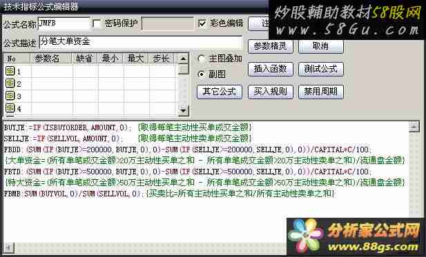 BUYJE:=IF(ISBUYORDER,AMOUNT,0); {取得每笔主动性买单成交金额} SELLJE:=IF(SELLVOL,AMOUNT,0); {取得每笔主动性卖单成交金额} FBDD:(SUM(IF(BUYJE>=200000,BUYJE,0),0)-SUM(IF(SELLJE>=200000,SELLJE,0),0))/CAPITAL*C/100; {大单资金=(所有单笔成交金额>20万主动性买单之和 - 所有单笔成交金额>20万主动性卖单之和)/流通盘金额} FBTD:(SUM(IF(BUYJE>=500000,BUYJE,0),0)-SUM(IF(SELLJE>=500000,SELLJE,0),0))/CAPITAL*C/100; {特大资金=(所有单笔成交金额>50万主动性买单之和 - 所有单笔成交金额>50万主动性卖单之和)/流通盘金额} FBMB:SUM(BUYVOL,0)/SUM(SELLVOL,0);{买卖比=所有主动性买单之和/所有主动性卖单之和}