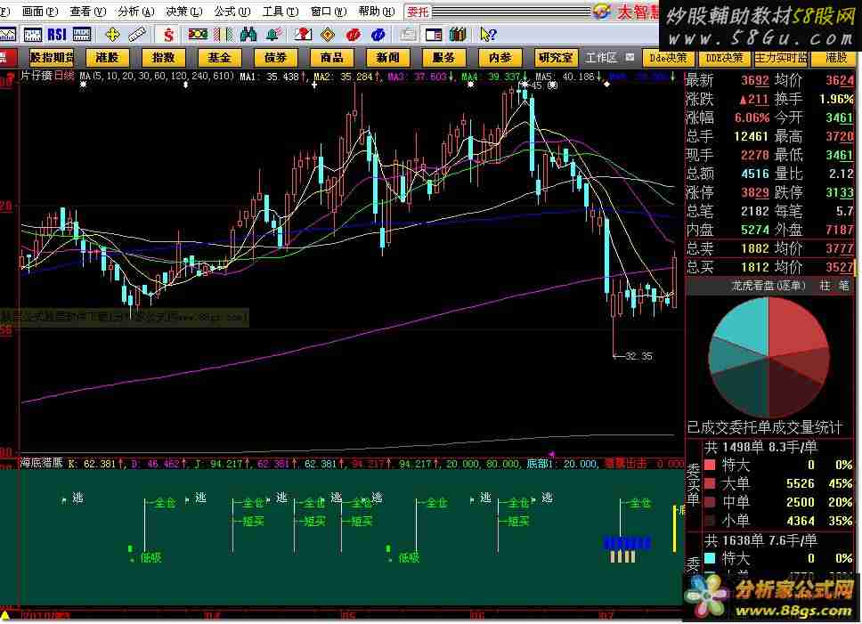 VAR5E:=((((MA(AMOUNT,5) / MA(VOL,5)) / 100) - ((MA(AMOUNT,125) / MA(VOL,125)) / 100)) / ((MA(AMOUNT,5) / MA(VOL,5)) / 100)); VAR5F:=MA((((LLV(LOW,45) - CLOSE) / (HHV(HIGH,45) - LLV(LOW,45))) * 100),5); VAR60:=((CROSS((0 - 5),VAR5F) AND (VAR5E < (0 - 0.4))) AND (((CLOSE - MA(CLOSE,30)) / MA(CLOSE,30)) < (0 - 0.19))); VAR61:=MA(CLOSE,3); VAR62:=(REF(CLOSE,2) * 0.865); VAR63:=(REF(CLOSE,13) * 0.772); VAR64:=MIN(VAR62,VAR63); VAR65:=((100 * VOL) / CAPITAL); VAR66:=MA(CLOSE,13); VAR67:=IF(((((CLOSE - VAR64) / CLOSE) < 0.03) AND ((SUM(VAR65,5) / 5) < 1.8)),1,0); 猎鹰出击:IF(((((VAR9 OR VAR16) OR VAR53) OR VAR5B) OR ((((CLOSE - VAR64) / CLOSE) < 0.03) AND ((SUM(VAR65,5) / 5) < 1.8))),120,0),LINETHICK2,color0000FF; VAR68:=0; MACD:(VAR6 * 5),COLORSTICK,LINETHICK2; STICKLINE((CROSS(K,D) AND (BB10 > 1)),70,0,2,0),colorCC99FF; DRAWTEXT((CROSS(K,D) AND (BB10 > 1)),64,'--短买'),color00FF00; DRAWICON((CROSS(K,D) AND (BB10 > 1)),70,0); 底部预警:STICKLINE((VAR6 <= (0 - 10)),0,(0 - 20),5,0),color88B7EA; VARQ:=MA(CLOSE,152); VARW:=MA(CLOSE,194.16); VAREe:=(VARW + (2 * STD(CLOSE,170))); VARR:=(VARQ + (2 * STD(CLOSE,170))); VART:=IF((DATE > 1080822),0,1); VAR611:=EMA(HHV(HIGH,500),21); VAR71:=EMA(HHV(HIGH,250),21); VAR81:=EMA(HHV(HIGH,90),21); VAR91:=EMA(LLV(LOW,500),21); VARA1:=EMA(LLV(LOW,250),21); VARB1:=EMA(LLV(LOW,90),21); VARC1:=EMA((((((((VAR91 * 0.96) + (VARA1 * 0.96)) + (VARB1 * 0.96)) + (VAR611 * 0.558)) + (VAR71 * 0.558)) + (VAR81 * 0.558)) / 6),21); VARD1:=EMA((((((((VAR91 * 1.25) + (VARA1 * 1.23)) + (VARB1 * 1.2)) + (VAR611 * 0.55)) + (VAR71 * 0.55)) + (VAR81 * 0.65)) / 6),21); VARE1:=EMA((((((((VAR91 * 1.3) + (VARA1 * 1.3)) + (VARB1 * 1.3)) + (VAR611 * 0.68)) + (VAR71 * 0.68)) + (VAR81 * 0.68)) / 6),21); VARF1:=EMA((((((VARC1 * 3) + (VARD1 * 2)) + VARE1) / 6) * 1.738),21); VAR101:=REF(LOW,1); VAR111:=((SMA(ABS((LOW - VAR101)),3,1) / SMA(MAX((LOW - VAR101),0),3,1)) * 100); VAR121:=EMA(IF(((CLOSE * 1.35) <= VARF1),(VAR111 * 10),(VAR111 / 10)),3); VAR131:=LLV(LOW,30); VAR141:=HHV(VAR121,30); VAR151:=IF(MA(CLOSE,58),1,0); VAR161:=((EMA(IF((LOW <= VAR131),((VAR121 + (VAR141 * 2)) / 2),0),3) / 618) * VAR151); VAR171:=(((IF((VAR161 > 50),50,VAR161) / 20) * 15) * VART); 底部吸筹:STICKLINE((VAR171 > 0),0,VAR171,1,1),colorFF00FF; STICKLINE(((CROSS(K,D) AND ((AA10 - REF(AA10,1)) > 0)) AND (K <= 49)),80,0,3,0),color0000FF; DRAWTEXT(((CROSS(K,D) AND ((AA10 - REF(AA10,1)) > 0)) AND (K <= 49)),80,'--抄底'),color0000FF; STICKLINE(CROSS(90,J),88,100,2,0),color00FF00; DRAWTEXT(CROSS(90,J),108,'。逃'),colorFFFFFF; STICKLINE(CROSS(J,(0 - 5)),0,10,6,0),color00FF00; DRAWTEXT(CROSS(J,(0 - 5)),(0 - 4),'。低吸'),color00FF00; SG:=EMA(HHV(HIGH,1),8); X1:=EMA(CLOSE,8); X30:=((X1 < REF(X1,1)) AND (CLOSE < X1)); X31:=IF(((SG < REF(SG,1)) OR X30),1,0); 全仓出击:=((((COUNT((X31 = 1),4) = 3) AND (X31 = 0)) AND (((CLOSE - REF(CLOSE,1)) / REF(CLOSE,1)) > 0.085)) * 89); STICKLINE(全仓出击>=89,0,100,6,0),color0000FF; DRAWICON((全仓出击 >= 89),全仓出击,1); DRAWTEXT((全仓出击 >= 89),89,'--大胆杀入'); 开始关注:STICKLINE((VAR6 <= (0 - 8)),5,25,7,0); STICKLINE((CROSS(J,0) AND (VAR6 <= (0 - 7))),0,100,8,0),color000078; STICKLINE((CROSS(J,0) AND (VAR6 <= (0 - 7))),0,100,6,0),color00009D; STICKLINE((CROSS(J,0) AND (VAR6 <= (0 - 7))),0,100,5,0),color0000FF; STICKLINE((CROSS(J,0) AND (VAR6 <= (0 - 7))),0,100,2,0),color007AB5; DRAWTEXT((CROSS(J,0) AND (VAR6 <= (0 - 7))),100,'--导弹发射'),color0000FF; 均5:=MA(CLOSE,4); X7:=EMA(EMA(EMA(HIGH,9),9),9); 海底:=(X7 * 0.92); 海底2:=(X7 * 0.933); 中轨道:=MA(CLOSE,2); DRAWTEXT(((CROSS(中轨道,均5) AND (LOW <= 海底)) AND (CLOSE >= 海底2)),85,'-底部'),color00FFFF; STICKLINE(((CROSS(中轨道,均5) AND (LOW <= 海底)) AND (CLOSE >= 海底2)),0,85,4,0),color00FFFF; |