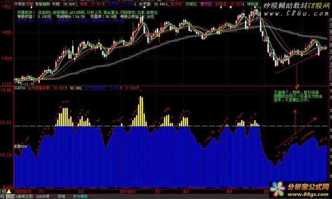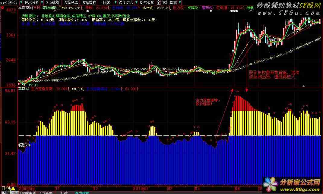 幅图,蓝色表示控盘系数<50%, 控盘度比较低; 黄色表示控盘系数在50%---75%之间,中度控盘; 红色情示控盘高于75%,看图表,当控盘过高也有下跌的可能,关键在于主力是否持续增加,如果没有增加,则选高点卖出, 红色的圈圈,表示当时控盘系数高于昨日,表示控盘系数的递增,