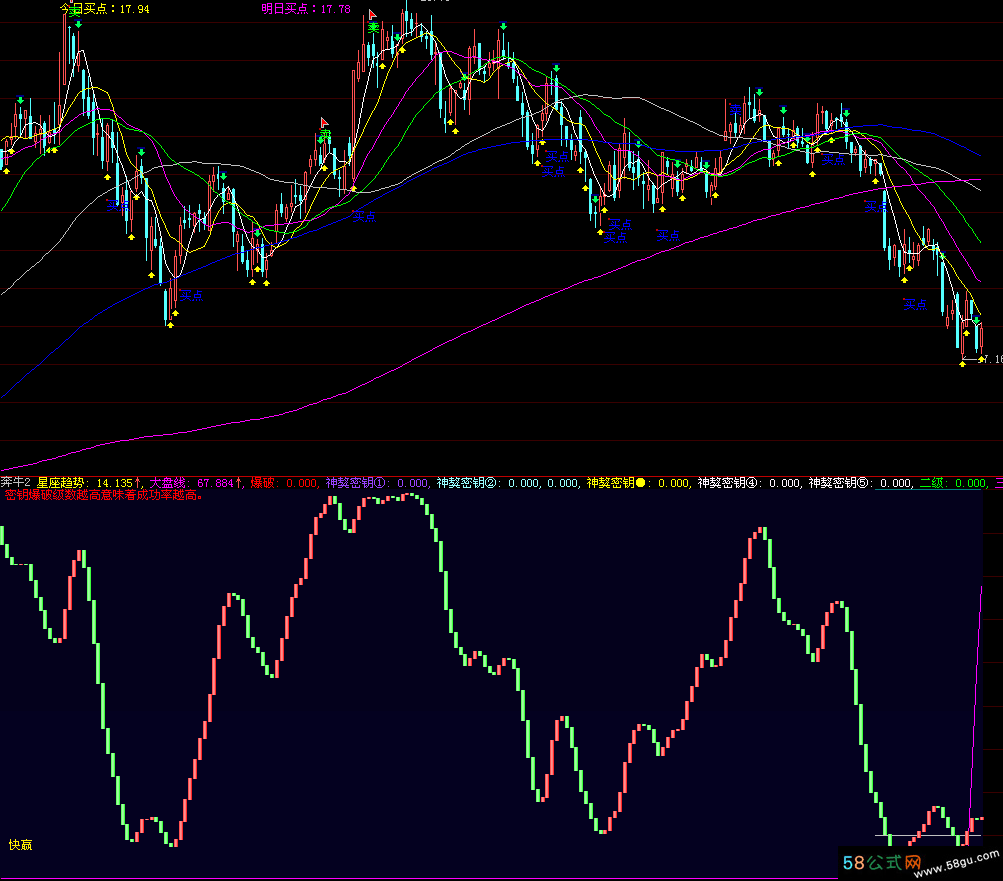 DRAWGBK((CLOSE > 0),STRIP(RGB(4,1,28),RGB(4,1,35),0)); A1:=(25); A2:=(26); A3:=(3 * (SMA((((CLOSE - (LLV(LOW,A1))) / ((HHV(HIGH,A1)) - (LLV(LOW,A1)))) * 100),5,1))) - (2 * (SMA((SMA((((CLOSE - (LLV(LOW,A2))) / ((HHV(HIGH,A2)) - (LLV(LOW,A2)))) * 100),5,1)),3,1))); A4:=(3 * (SMA((((INDEXC - (LLV(INDEXL,A1))) / ((HHV(INDEXH,A1)) - (LLV(INDEXL,A1)))) * 100),5,1))) - (2 * (SMA((SMA((((INDEXC - (LLV(INDEXL,A2))) / ((HHV(INDEXH,A2)) - (LLV(INDEXL,A2)))) * 100),5,1)),3,1))); 星座趋势:EMA(A3,5),linethick0; A5:=REF(星座趋势,1); A6:=EMA(A3,3); 大盘线:EMA(A4,3),colorMagenta; A7:=星座趋势 > A5; A8:=星座趋势 < A5; A9:=((CLOSE / (REF(CLOSE,1))) - 1) * 100; A10:=(IF((DATE <= 1091025),1,0)) * (IF((CURRENTDATE <= 1091025),1,0)); A11:=BIGORDER(1,3); A12:=BIGORDER(2,3); A13:=BIGORDER(1,2); A14:=BIGORDER(2,2); A15:=((((A13 - A14) * VOL) / CAPITAL) * 500) * A10; A16:=((((A11 - A12) * VOL) / CAPITAL) * 500) * A10; A17:=IF(((A15 >= 0) AND (A16 >= 0)),(MAX(A15,A16)),(MIN(A15,A16))); A18:=IF((A9 > 0),A9,ABS(A9)); A19:=IF(((A17 > 0) AND (A9 < 0)),A9,A18); A20:=A17 - A19; 爆破:IF((A20 > 0),A20,0),linethick0,colorRed; A21:=((CLOSE - (EMA(CLOSE,25))) / (EMA(CLOSE,25))) * 100; A22:=((CLOSE - CYC(13)) / CYC(13)) * 100; A23:=IF((CLOSE < 800),((AMOUNT / VOL) / 100),((((CLOSE * 2) + HIGH) + LOW) / 4)); A24:=((EMA((MA(A23,3)),3)) + (WMA(A23,5))) / 2; A25:=REF(A24,1); A26:=BARSCOUNT(CLOSE); A27:=IF((A26 = 1),0,(((A24 - A25) / A25) * 100)); 神獒密钥①:(((A20 > 6) AND (A27 < -3.5)) AND (A22 < -18)) AND (A21 > -20),linethick0,ColorFF4398; STICKLINE(神獒密钥①,10,0,2,0),linethick0,ColorFF4398; DRAWTEXT(神獒密钥①,A20,'神獒密钥①成功率93%'),ColorFF4398; 神獒密钥②:(((A20 >= 5) AND (A27 < -3)) AND (A21 < -22)) AND (A22 < -22),linethick0,ColorFFFF98; STICKLINE(神獒密钥②,12,0,2,0),linethick0,ColorFFFF98; DRAWTEXT(神獒密钥②,A20,'神獒密钥②成功率97%'),ColorFFFF98; 神獒密钥●:((((A20 >= 8) AND (A27 < -5)) AND (A21 < -13)) AND (A22 < -16)) AND (A15 >= 1),linethick0,Color00FDFF; STICKLINE(神獒密钥●,14,0,2,0),linethick0,Color00FDFF; DRAWTEXT(神獒密钥●,A20,'神獒密钥●成功率99%'),Color00FDFF; 神獒密钥④:((((A20 >= 4) AND (A27 < -4)) AND (A21 < -10)) AND (A22 < -12)) AND (A15 >= 0.5),linethick0,ColorFFF6FF; STICKLINE(神獒密钥④,14,0,2,0),linethick0,ColorFFF6FF; DRAWTEXT(神獒密钥④,A20,'神獒密钥④成功率90%'),ColorFFF6FF; 神獒密钥⑤:((((A20 >= 4) AND (A27 < -3)) AND (A21 < -10)) AND (A22 < -13)) AND (A15 >= 0.5),linethick0,ColorFFF6FF; STICKLINE(神獒密钥⑤,14,0,2,0),linethick0,ColorFFF6FF; DRAWTEXT(神獒密钥⑤,A20,'神獒密钥⑤成功率90%'),ColorFFF6FF; 二级:((((A20 >= 4) AND (A15 > 0.2)) AND (A27 < -4)) AND (A22 < -14)) AND (A21 > -10),linethick0,colorGreen; 三级:((((A20 >= 6) AND (A27 < -2.5)) AND (A22 < -18)) AND (A21 < -14)) AND (A15 > 0.2),linethick0,colorMagenta; 四级:((A20 >= 8) AND (A27 < -5)) AND (A22 < -18),linethick0,colorRed; 五级:((A20 >= 10) AND ((A15 > 1) OR (A16 > 2.5))) AND (A15 > 0.2),linethick0,ColorFF0000; DRAWTEXTREL(0,0,' 密钥爆破级数越高意味着成功率越高。'),linethick1,colorRed; STICKLINE(二级,14,0,2,0),colorGreen; STICKLINE(三级,13,0,4,0),colorMagenta; STICKLINE(四级,12,0,6,0),colorRed; STICKLINE(((A20 >= 10) AND ((A15 > 1) OR (A16 > 2.5))),10,0,8,0),ColorFF0000; STICKLINE(((A20 > 5) AND (A15 > 1)),(A20 * 2),0,0.5,0),colorYellow; STICKLINE(A8,星座趋势,A5,6,0),Color3DFF3D; STICKLINE(A8,星座趋势,A5,5,0),Color51FF51; STICKLINE(A8,星座趋势,A5,4,0),Color65FF65; STICKLINE(A8,星座趋势,A5,3,0),Color7AFF7A; STICKLINE(A8,星座趋势,A5,2,0),Color8EFF8E; STICKLINE(A8,星座趋势,A5,1,0),ColorA2FFA2; STICKLINE(A7,星座趋势,A5,6,0),Color2828FF; STICKLINE(A7,星座趋势,A5,5,0),Color3D3DFF; STICKLINE(A7,星座趋势,A5,4,0),Color5151FF; STICKLINE(A7,星座趋势,A5,3,0),Color6565FF; STICKLINE(A7,星座趋势,A5,2,0),Color7A7AFF; STICKLINE(A7,星座趋势,A5,1,0),Color8E8EFF; IF((((CROSS(A5,星座趋势)) AND (星座趋势 > 85)) AND (((((A13 - A14) * VOL) / CAPITAL) * 500) < -0.65)),70,90); IF((((CROSS(星座趋势,A5)) AND (星座趋势 < 15)) AND (((((A13 - A14) * VOL) / CAPITAL) * 500) > 0.3)),20,10); DRAWTEXTREL(10,900,'快赢'),linethick1,COLOR00EEff; {点击看本软件截图: 58股票 公式网 http://www. 58gu. com 整理} |