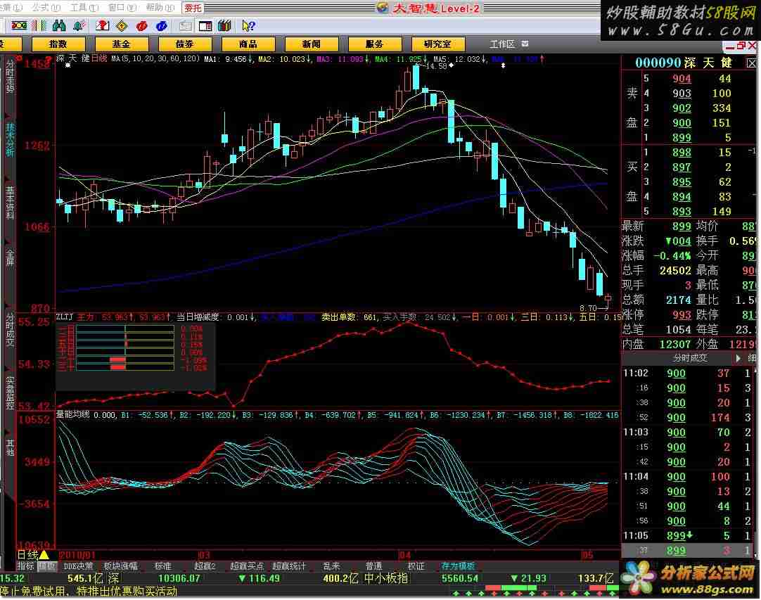 量能均线QJJ:=VOL/((HIGH-LOW)*2-ABS(CLOSE-OPEN));XVL:=(IF(CLOSE>OPEN,QJJ*(HIGH-LOW),IF(CLOSE<OPEN,QJJ*(HIGH-OPEN+CLOSE-LOW),VOL/2))+IF(CLOSE>OPEN,0-QJJ*(HIGH-CLOSE+OPEN-LOW),IF(CLOSE<OPEN,0-QJJ*(HIGH-LOW),0-VOL/2)));HSL:=(XVL/20)/1.15;攻击:=((HSL*0.55+(REF(HSL,1)*0.33))+(REF(HSL,2)*0.22));LLJX:=EMA(攻击,3);0,POINTDOT,COLORWHITE;B1:SUM(LLJX,1),COLORCYAN;B2:SUM(LLJX,2),COLORCYAN;B3:SUM(LLJX,3),COLORCYAN;B4:SUM(LLJX,4),COLORCYAN;B5:SUM(LLJX,5),COLORCYAN;B6:SUM(LLJX,6),COLORCYAN;B7:SUM(LLJX,7),COLORCYAN;B8:SUM(LLJX,8),COLORCYAN;B9:SUM(LLJX,9),COLORCYAN;B10:SUM(LLJX,10),COLORCYAN;A1:IF(B1>REF(B1,1),B1,DRAWNULL),COLORRED;A2:IF(B2>REF(B2,1),B2,DRAWNULL),COLORRED;A3:IF(B3>REF(B3,1),B3,DRAWNULL),COLORRED;A4:IF(B4>REF(B4,1),B4,DRAWNULL),COLORRED;A5:IF(B5>REF(B5,1),B5,DRAWNULL),COLORRED;A6:IF(B6>REF(B6,1),B6,DRAWNULL),COLORRED;A7:IF(B7>REF(B7,1),B7,DRAWNULL),COLORRED;A8:IF(B8>REF(B8,1),B8,DRAWNULL),COLORRED;A9:IF(B9>REF(B9,1),B9,DRAWNULL),COLORRED;A10:IF(B10>REF(B10,1),B10,DRAWNULL),COLORRED; {点击看本软件截图: 58股票 公式网 http://www. 58gu. com 整理} |