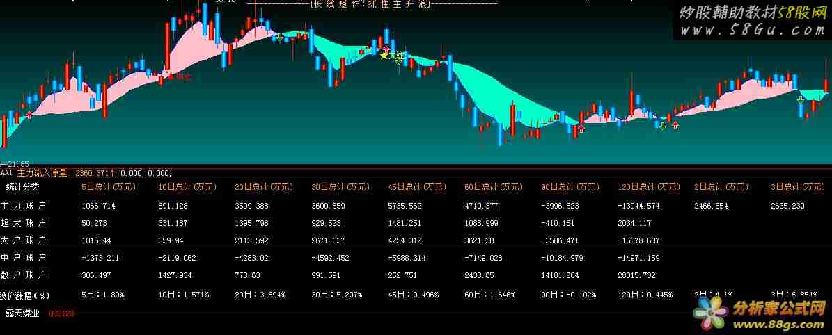 2.3.5.10.20.30.45.60.90.120日主力资金变化图表-中线选股辅助工具。 本指标用法在3楼,本指标系源于理想加以改动,关键在于要提取选股公式,才能发挥本指标的作用。对30楼的答复在34楼。 VAR0:=REF(AMOUNT,3)/10000/10000; VAR1:=REF(AMOUNT,4)/10000/10000; VAR2:=REF(AMOUNT,2)/10000/10000; VAR3:=REF(AMOUNT,1)/10000/10000; VAR4:=AMOUNT/10000/10000; DRAWTEXTABS(16,8,'统计分类'),COLORWHITE; VAR5:=AMOUNT * BIGORDER(1,3); VAR6:=AMOUNT * (BIGORDER(1,2) - BIGORDER(1,3)); VAR7:=AMOUNT * (BIGORDER(1,1) - BIGORDER(1,2)); VAR8:=AMOUNT * (1 - BIGORDER(1,1)); VAR9:=VAR5 + VAR6 + VAR7 + VAR8; VAR10:=AMOUNT * BIGORDER(2,3); VAR11:=AMOUNT * (BIGORDER(2,2) - BIGORDER(2,3)); VAR12:=AMOUNT * (BIGORDER(2,1) - BIGORDER(2,2)); VAR13:=AMOUNT * (1 - BIGORDER(2,1)); VAR14:=(BIGORDER(1,2) - BIGORDER(2,2)) * VOL/CAPITAL * 100; VAR15:=BIGORDER(1,2) * AMOUNT/10000; VAR16:=BIGORDER(2,2) * AMOUNT/10000; 主力流入净量:VAR15 - VAR16,LINETHICK0,COLOR00AAFF; VAR17:=REF(VAR15,0); VAR18:=REF(VAR15,1); VAR19:=REF(VAR15,2); VAR20:=REF(VAR15,3); VAR21:=REF(VAR15,5); VAR22:=REF(VAR16,0); VAR23:=REF(VAR16,1); VAR24:=REF(VAR16,2); VAR25:=REF(VAR16,3); VAR26:=REF(VAR16,4);DRAWTEXTABS(8,35,'主 力 账 户'),COLORWHITE; DRAWTEXTABS(8,60,'超 大 账 户'),COLORWHITE; DRAWTEXTABS(8,85,'大 户 账 户'),COLORWHITE; DRAWTEXTABS(8,110,'中 户 账 户'),COLORWHITE; DRAWTEXTABS(8,135,'散 户 账 户'),COLORWHITE; DRAWTEXTABS(5,165,'股价涨幅(%)'),COLORWHITE; DRAWTEXTABS(16,190,'' + STKNAME + ''),COLORWHITE; DRAWTEXTABS(78,190,'' + STKLABEL + ''),COLORRED; DRAWTEXTABS(125,35,'' + SUM(REF(VAR17 - VAR22,0),5) + ''),COLORWHITE; DRAWTEXTABS(235,35,'' + SUM(REF(VAR17 - VAR22,0),10) + ''),COLORWHITE; DRAWTEXTABS(345,35,'' + SUM(REF(VAR17 - VAR22,0),20) + ''),COLORWHITE; DRAWTEXTABS(455,35,'' + SUM(REF(VAR17 - VAR22,0),30) + ''),COLORWHITE; DRAWTEXTABS(565,35,'' + SUM(REF(VAR17 - VAR22,0),45) + ''),COLORWHITE; DRAWTEXTABS(675,35,'' + SUM(REF(VAR17 - VAR22,0),60) + ''),COLORWHITE; DRAWTEXTABS(785,35,'' + SUM(REF(VAR17 - VAR22,0),90) + ''),COLORWHITE; DRAWTEXTABS(895,35,'' + SUM(REF(VAR17 - VAR22,0),120) + ''),COLORWHITE; DRAWTEXTABS(1005,35,'' + SUM(REF(VAR17 - VAR22,0),2) + ''),COLORWHITE; DRAWTEXTABS(1115,35,'' + SUM(REF(VAR17 - VAR22,0),3) + ''),COLORWHITE; DRAWTEXTABS(125,60,'' + SUM(REF(VAR5 - VAR10,0)/10000,5) + ''),COLORWHITE; DRAWTEXTABS(235,60,'' + SUM(REF(VAR5 - VAR10,0)/10000,10) + ''),COLORWHITE; DRAWTEXTABS(345,60,'' + SUM(REF(VAR5 - VAR10,0)/10000,20) + ''),COLORWHITE; DRAWTEXTABS(455,60,'' + SUM(REF(VAR5 - VAR10,0)/10000,30) + ''),COLORWHITE; DRAWTEXTABS(565,60,'' + SUM(REF(VAR5 - VAR10,0)/10000,45) + ''),COLORWHITE; DRAWTEXTABS(675,60,'' + SUM(REF(VAR5 - VAR10,0)/10000,60) + ''),COLORWHITE; DRAWTEXTABS(785,60,'' + SUM(REF(VAR5 - VAR10,0)/10000,90) + ''),COLORWHITE; DRAWTEXTABS(895,60,'' + SUM(REF(VAR5 - VAR10,0)/10000,120) + ''),COLORWHITE;DRAWTEXTABS(125,85,'' + SUM(REF(VAR6 - VAR11,0)/10000,5) + ''),COLORWHITE; DRAWTEXTABS(235,85,'' + SUM(REF(VAR6 - VAR11,0)/10000,10) + ''),COLORWHITE; DRAWTEXTABS(345,85,'' + SUM(REF(VAR6 - VAR11,0)/10000,20) + ''),COLORWHITE; DRAWTEXTABS(455,85,'' + SUM(REF(VAR6 - VAR11,0)/10000,30) + ''),COLORWHITE; DRAWTEXTABS(565,85,'' + SUM(REF(VAR6 - VAR11,0)/10000,45) + ''),COLORWHITE; DRAWTEXTABS(675,85,'' + SUM(REF(VAR6 - VAR11,0)/10000,60) + ''),COLORWHITE; DRAWTEXTABS(785,85,'' + SUM(REF(VAR6 - VAR11,0)/10000,90) + ''),COLORWHITE; DRAWTEXTABS(895,85,'' + SUM(REF(VAR6 - VAR11,0)/10000,120) + ''),COLORWHITE; DRAWTEXTABS(125,110,'' + SUM(REF(VAR7 - VAR12,0)/10000,5) + ''),COLORWHITE; DRAWTEXTABS(235,110,'' + SUM(REF(VAR7 - VAR12,0)/10000,10) + ''),COLORWHITE; DRAWTEXTABS(345,110,'' + SUM(REF(VAR7 - VAR12,0)/10000,20) + ''),COLORWHITE; DRAWTEXTABS(455,110,'' + SUM(REF(VAR7 - VAR12,0)/10000,30) + ''),COLORWHITE; DRAWTEXTABS(565,110,'' + SUM(REF(VAR7 - VAR12,0)/10000,45) + ''),COLORWHITE; DRAWTEXTABS(675,110,'' + SUM(REF(VAR7 - VAR12,0)/10000,60) + ''),COLORWHITE; DRAWTEXTABS(785,110,'' + SUM(REF(VAR7 - VAR12,0)/10000,90) + ''),COLORWHITE; DRAWTEXTABS(895,110,'' + SUM(REF(VAR7 - VAR12,0)/10000,120) + ''),COLORWHITE;DRAWTEXTABS(125,135,'' + SUM(REF(VAR8 - VAR13,0)/10000,5) + ''),COLORWHITE; DRAWTEXTABS(235,135,'' + SUM(REF(VAR8 - VAR13,0)/10000,10) + ''),COLORWHITE; DRAWTEXTABS(345,135,'' + SUM(REF(VAR8 - VAR13,0)/10000,20) + ''),COLORWHITE; DRAWTEXTABS(455,135,'' + SUM(REF(VAR8 - VAR13,0)/10000,30) + ''),COLORWHITE; DRAWTEXTABS(565,135,'' + SUM(REF(VAR8 - VAR13,0)/10000,45) + ''),COLORWHITE; DRAWTEXTABS(675,135,'' + SUM(REF(VAR8 - VAR13,0)/10000,60) + ''),COLORWHITE; DRAWTEXTABS(785,135,'' + SUM(REF(VAR8 - VAR13,0)/10000,90) + ''),COLORWHITE; DRAWTEXTABS(895,135,'' + SUM(REF(VAR8 - VAR13,0)/10000,120) + ''),COLORWHITE; DRAWTEXTABS(125,8,'5日总计(万元)'),COLOR088FFF; DRAWTEXTABS(235,8,'10日总计(万元)'),COLOR088FFF; DRAWTEXTABS(345,8,'20日总计(万元)'),COLOR088FFF; DRAWTEXTABS(455,8,'30日总计(万元)'),COLOR088FFF; DRAWTEXTABS(565,8,'45日总计(万元)'),COLOR088FFF; DRAWTEXTABS(675,8,'60日总计(万元)'),COLOR088FFF; DRAWTEXTABS(785,8,'90日总计(万元)'),COLOR088FFF; DRAWTEXTABS(895,8,'120日总计(万元)'),COLOR088FFF; DRAWTEXTABS(1005,8,'2日总计(万元)'),COLOR088FFF; DRAWTEXTABS(1115,8,'3日总计(万元)'),COLOR088FFF;DRAWTEXTABS(125,163,'5日:' + SUM((CLOSE - REF(CLOSE,1))/REF(CLOSE,1) * 100,5) + '%'),COLORWHITE; DRAWTEXTABS(235,163,'10日:' + SUM((CLOSE - REF(CLOSE,1))/REF(CLOSE,1) * 100,10) + '%'),COLORWHITE; DRAWTEXTABS(345,163,'20日:' + SUM((CLOSE - REF(CLOSE,1))/REF(CLOSE,1) * 100,20) + '%'),COLORWHITE; DRAWTEXTABS(455,163,'30日:' + SUM((CLOSE - REF(CLOSE,1))/REF(CLOSE,1) * 100,30) + '%'),COLORWHITE; DRAWTEXTABS(565,163,'45日:' + SUM((CLOSE - REF(CLOSE,1))/REF(CLOSE,1) * 100,45) + '%'),COLORWHITE; DRAWTEXTABS(675,163,'60日:' + SUM((CLOSE - REF(CLOSE,1))/REF(CLOSE,1) * 100,60) + '%'),COLORWHITE; DRAWTEXTABS(785,163,'90日:' + SUM((CLOSE - REF(CLOSE,1))/REF(CLOSE,1) * 100,9) + '%'),COLORWHITE; DRAWTEXTABS(895