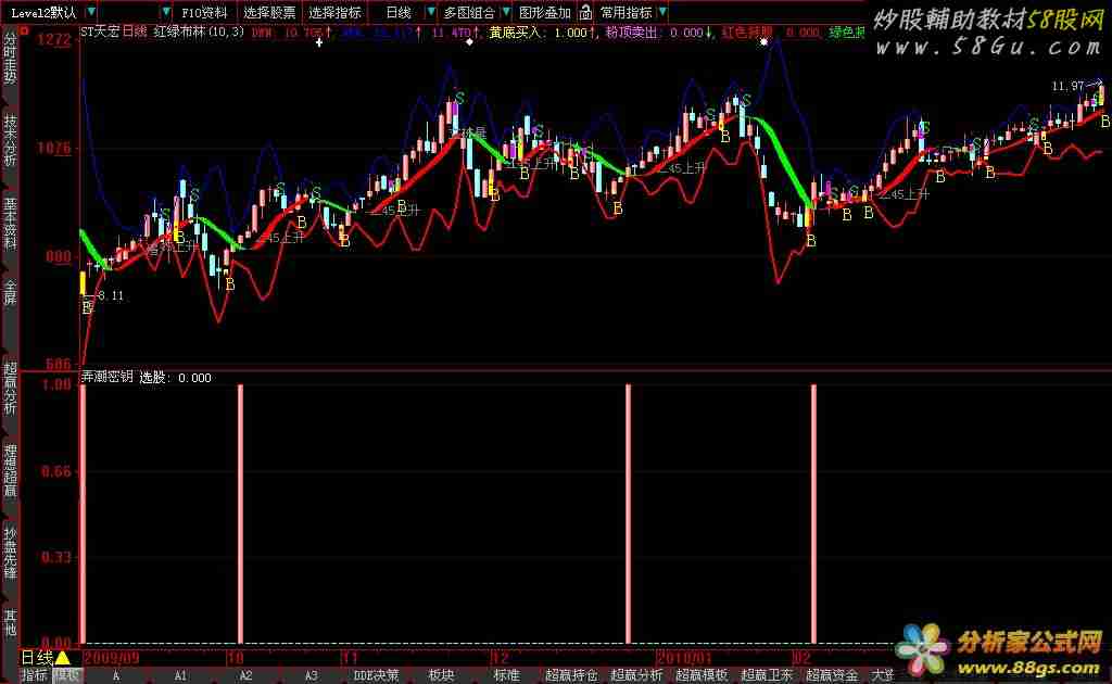 发一个弄潮密钥选股。弄潮密钥是根据神獒密钥原理翻红选股,原码如下:A1:=(25); A2:=(26); A3:=(3 * (SMA((((CLOSE - (LLV(LOW,A1))) / ((HHV(HIGH,A1)) - (LLV(LOW,A1)))) * 100),5,1))) - (2 * (SMA((SMA((((CLOSE - (LLV(LOW,A2))) / ((HHV(HIGH,A2)) - (LLV(LOW,A2)))) * 100),5,1)),3,1))); A4:=(3 * (SMA((((INDEXC - (LLV(INDEXL,A1))) / ((HHV(INDEXH,A1)) - (LLV(INDEXL,A1)))) * 100),5,1))) - (2 * (SMA((SMA((((INDEXC - (LLV(INDEXL,A2))) / ((HHV(INDEXH,A2)) - (LLV(INDEXL,A2)))) * 100),5,1)),3,1))); 星座趋势:=EMA(A3,5); A5:=REF(星座趋势,1); 弄潮密钥:CROSS(星座趋势,A5) and 星座趋势<50; {点击看本软件截图: 58股票 公式网 http://www. 58gu. com 整理} |