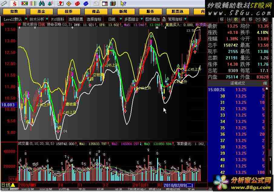 {使命召唤}此指标为别人原创,我把它细化以使广大新同学 看的更加清楚。在此特向原创表示谢意{n 10 1 100 p 3 0.1 10} BBI:=(MA(CLOSE,3)+MA(CLOSE,6)+MA(CLOSE,12)+MA(CLOSE,24))/4; DWN:BBI-P*STD(BBI,N),linethick2; UPR:BBI+P*STD(BBI,N),linethick2; MA5:ma(c,5),COLORFF50FF,linethick2; partline(MA5,MA5>=ref(MA5,1),rgb(255,0,0),MA5<ref(MA5,1),rgb(0,250,0)),linethick3; DRAWGBKLAST(MA5>=ref(MA5,1),STRIP(RGB(95,95,95),RGB(0,0,0),1)); DRAWGBKLAST(MA5<=ref(MA5,1),STRIP(RGB(95,95,95),RGB(0,0,0),1)); VAR326:=IF(CLOSE>REF(CLOSE,1),88,0); VAR327:=IF(CLOSE/REF(CLOSE,1)>1.050 AND HIGH/CLOSE<1.010 AND VAR326>0, 91, 0); DRAWTEXT(VAR327>90,LOW*0.99,'追'),COLORYELLOW; STICKLINE(VAR327>90,OPEN,CLOSE,3,0),COLORYELLOW; STICKLINE(VAR327>90,LOW,HIGH,0,0 ),COLORYELLOW; {45度异动} x1:=(C+L+H)/3; bb13:=atan(ema(x1,13)-ref(ema(x1,13),1))*3.1416*10; ema8:=ema(c,8); DRAWTEXT(filter(bb13>1 and ema(x1,13)>ref(ema(x1,8),1),10), ema8,'∠45上升'),coloryellow; AAA:=(3*C+H+L+O)/6; VAR41:=(8*AAA+7*REF(AAA,1)+6*REF(AAA,2)+5*REF(AAA,3)+4*REF(AAA,4)+3*REF(AAA,5)+2*REF(AAA,6)+REF(AAA,8))/36; TJ1:=VOL=HHV(VOL,10) AND VOL>2*REF(VOL,1) AND CLOSE>VAR41; 立桩量:=FILTER(TJ1,5); TJ2:=IF(BARSLAST(立桩量)=1 AND CLOSE>REF(HIGH,1),1,IF(BARSLAST(立桩量)=2 AND CLOSE>REF(HIGH,2),1,IF(BARSLAST(立桩量)=3 AND CLOSE>REF(HIGH,3),1,0))); 突破:=TJ2=1; TJ3:=IF(BARSLAST(立桩量)=1 AND CLOSE>REF(LOW,1),1,IF(BARSLAST(立桩量)=2 AND CLOSE>REF(LOW,2),1,IF(BARSLAST(立桩量)=3 AND CLOSE>REF(LOW,3),1,0))); 三天法则:=TJ3=1; 成立:=三天法则 AND 突破; 条件成立:=FILTER(成立,3); DRAWTEXT(条件成立,L*0.99,'立桩量'),COLORYELLOW; var1:=CLOSE>REF(CLOSE,1) AND CLOSE>REF(CLOSE,2); var2:=REF(var1,1) AND CLOSE<=REF(CLOSE,1) AND CLOSE>=REF(CLOSE,2); var3:=REF(var2,1) AND CLOSE>=REF(CLOSE,1) AND CLOSE<=REF(CLOSE,2); var4:=REF(var3,1) AND CLOSE<=REF(CLOSE,1) AND CLOSE>=REF(CLOSE,2); var5:=REF(var4,1) AND CLOSE>=REF(CLOSE,1) AND CLOSE<=REF(CLOSE,2); var6:=REF(var5,1) AND CLOSE<=REF(CLOSE,1) AND CLOSE>=REF(CLOSE,2); var7:=REF(var6,1) AND CLOSE>=REF(CLOSE,1) AND CLOSE<=REF(CLOSE,2); var8:=REF(var7,1) AND CLOSE<=REF(CLOSE,1) AND CLOSE>=REF(CLOSE,2); var9:=REF(var8,1) AND CLOSE>=REF(CLOSE,1) AND CLOSE<=REF(CLOSE,2); varA:=REF(var9,1) AND CLOSE<=REF(CLOSE,1) AND CLOSE>=REF(CLOSE,2); varB:=REF(varA,1) AND CLOSE>=REF(CLOSE,1) AND CLOSE<=REF(CLOSE,2); varC:=REF(varB,1) AND CLOSE<=REF(CLOSE,1) AND CLOSE>=REF(CLOSE,2); varD:=CLOSE<REF(CLOSE,1) AND CLOSE<REF(CLOSE,2); varE:=REF(varD,1) AND CLOSE>=REF(CLOSE,1) AND CLOSE<=REF(CLOSE,2); varF:=REF(varE,1) AND CLOSE<=REF(CLOSE,1) AND CLOSE>=REF(CLOSE,2); var10:=REF(varF,1) AND CLOSE>=REF(CLOSE,1) AND CLOSE<=REF(CLOSE,2); var11:=REF(var10,1) AND CLOSE<=REF(CLOSE,1) AND CLOSE>=REF(CLOSE,2); var12:=REF(var11,1) AND CLOSE>=REF(CLOSE,1) AND CLOSE<=REF(CLOSE,2); var13:=REF(var12,1) AND CLOSE<=REF(CLOSE,1) AND CLOSE>=REF(CLOSE,2); var14:=REF(var13,1) AND CLOSE>=REF(CLOSE,1) AND CLOSE<=REF(CLOSE,2); var15:=REF(var14,1) AND CLOSE<=REF(CLOSE,1) AND CLOSE>=REF(CLOSE,2); var16:=REF(var15,1) AND CLOSE>=REF(CLOSE,1) AND CLOSE<=REF(CLOSE,2); var17:=REF(var16,1) AND CLOSE<=REF(CLOSE,1) AND CLOSE>=REF(CLOSE,2); var18:=REF(var17,1) AND CLOSE>=REF(CLOSE,1) AND CLOSE<=REF(CLOSE,2); var19:=REF(varD OR varE OR varF OR var10 OR var11 OR var12 OR var13 OR var14 OR var15 OR var16 OR var17 OR var18,1) AND var1; var1A:=REF(var1 OR var2 OR var3 OR var4 OR var5 OR var6 OR var7 OR var8 OR var9 OR varA OR varB OR varC,1) AND varD; STICKLINE(var19,REF(CLOSE,1),REF(CLOSE,2),8,0),COLOR00FFFF;{黄色} STICKLINE(var1A,REF(CLOSE,1),REF(CLOSE,2),8,0),COLORFF00FF;{粉红色} 黄底买入:var19,linethick0,COLOR00ffff; 粉顶卖出:var1A,linethick0,COLORFF50FF; 红色持股:0,linethick0,COLORRED; 绿色持币:0,linethick0,COLOR00d900; DRAWICON(var19,REF(CLOSE,1)*0.99,7),ALIGN1; DRAWICON(var1A,REF(CLOSE,1)*1.02,8),ALIGN1; 附图:主图显示的就是该指标。 {点击看本软件截图: 58股票 公式网 http://www. 58gu. com 整理} |