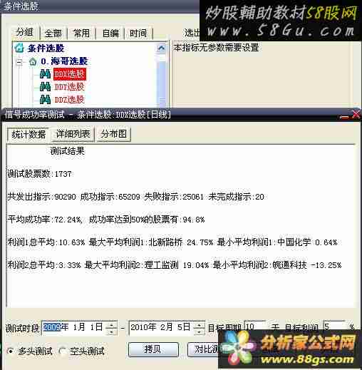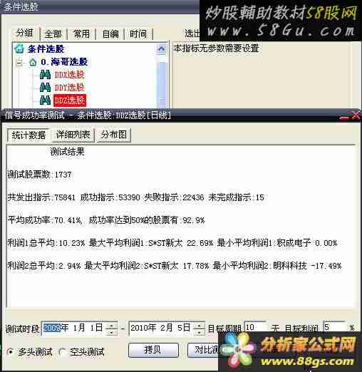 大智慧的DDE决策系统有很多人对它都很迷惑,现用DDX、DDY和DDZ设计选股条件,测试10天获利5%短线成功率高达70%以上: