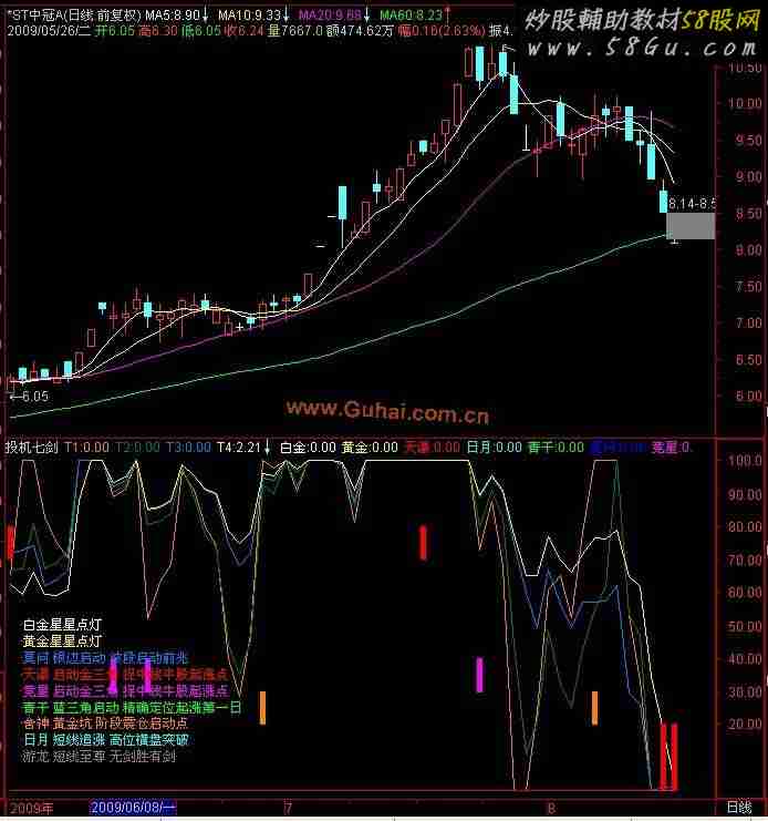 {七剑原码} T1:100*(C-LLV(L,5))/(HHV(C,5)-LLV(L,5)),COLOR0080FF; T2:100*(C-LLV(L,10))/(HHV(C,10)-LLV(L,10)),COLOR008000; T3:100*(C-LLV(L,20))/(HHV(C,20)-LLV(L,20)),COLORFF8000; T4:100*(C-LLV(L,30))/(HHV(C,30)-LLV(L,30)),COLOR00FFFF; {白金} {白金星星点灯} {20T 10% 100%} AA1:=BARSLAST(CROSS(30,T1))<2 AND BARSLAST(CROSS(T1,50))<2; BB1:=BARSLAST(CROSS(T4,T1))<2 AND T1>T4; EE1:=T1>60 AND T4>70; 白金:AA1 AND BB1 AND EE1,LINETHICK0,COLORWHITE; {黄金} {黄金星星点灯} {20T 10% 94.05%} AA2:=BARSLAST(CROSS(50,T1))<3 AND BARSLAST(CROSS(T1,50))<3; BB2:=BARSLAST(CROSS(T4,T1))<2 AND T1>T4; 黄金:AA2 AND BB2,LINETHICK0,COLORYELLOW; {天瀑} {启动金三角 (捉中线牛股起涨点)} XG1:=BARSLAST(CROSS(T4,T1))<5 AND T1>T4; 天瀑:COUNT(XG1,3)=1 AND XG1,LINETHICK0,COLORRED; {日月} {短线追涨 (高位横盘突破)} A:=BARSLAST(CROSS(97,T1))<=1 AND BARSLAST(CROSS(T1,85))<=1; B:=BARSLAST(CROSS(97,T2))<=1 AND BARSLAST(CROSS(T2,85))<=1; A1:=A AND B; AA:=BARSLAST(CROSS(97,T1))<=2 AND BARSLAST(CROSS(T1,85))<=1; BA:=BARSLAST(CROSS(97,T2))<=2 AND BARSLAST(CROSS(T2,85))<=1; A2:=AA AND BA ; AAA:=BARSLAST(CROSS(97,T1))<=3 AND BARSLAST(CROSS(T1,85))<=1; BAA:=BARSLAST(CROSS(97,T2))<=3 AND BARSLAST(CROSS(T2,85))<=1; A3:=AAA AND BAA ; B1:=REF(A1,1); B2:=REF(A2,1); B3:=REF(A3,1); D1:=T1=100 AND T2=100 AND A1 ; D2:=T1=100 AND T2=100 AND A2 ; D3:=T1=100 AND T2=100 AND A3 ; 日月:D1 OR D2 OR D3,LINETHICK0,COLORCYAN; {青干}{蓝三角启动 (精确定位起涨第一日)} AA3:=BARSLAST(CROSS(95,T1))<=2; BB3:=BARSLAST(CROSS(95,T2))<=2; EE3:= T4<T1 AND T1<T2 AND T1<T3; FF3:=T2>50 AND T3>50; GG3:=T1=100 AND T2=100; TX:=COUNT(GG3,2)=1; 青干:AA3 AND BB3 AND EE3 AND FF3 AND TX,LINETHICK0,COLORGREEN; {莫问} {银边启动 (波段启动前兆)} AA4:=T3=100; BB4:=T4<90; 莫问:COUNT(A,2) = 2 AND B ,LINETHICK0,COLORBLUE; {竞星}{启动金三角 (捉中线牛股起涨点)} AA5:=T1=T2 AND T2=T3 AND T1=100 AND T4>96; BB5:=COUNT(AA5,2)=1; DD5:=T1<T2 AND T1<T3 AND T1<T4 AND T2<T3 AND T4<95; YH:=INDEXC/REF(INDEXC,1)*REF(C,1); YH1:=REF(C,1)+C-INDEXC/REF(INDEXC,1)*REF(C,1); X1:=EMA(YH1,7); X2:=EMA(YH1,14); X3:=EMA(X1,14); EE5:=X1>X2 AND X2>X3; 竞星:BB5 AND DD5 AND EE5,LINETHICK0,COLORMAGENTA; {舍神} {阶段震仓启动点(黄金坑)} AA6:=BARSLAST(CROSS(T4,T1))>3 AND BARSLAST(CROSS(T1,T4))<3; BB6:=BARSLAST(CROSS(T4,T2)); DD6:=T3<T4 AND T2<T4; EE6:=BARSLAST(CROSS(T4,T3))>3 AND BARSLAST(CROSS(T1,T4))<3; FF6:=T2<T3 AND T2<T4 AND T2<T1 AND T1=100; 舍神:AA6 AND BB6 AND DD6 AND EE6 AND FF6,LINETHICK0,COLOR0080FF; {画剑} STICKLINE(白金=1,90,100,1,0),COLORWHITE; STICKLINE(黄金=1,80,90,1,0),COLORYELLOW; STICKLINE(天瀑=1,70,80,1,0),COLORRED; STICKLINE(日月=1,60,70,1,0),COLORCYAN; STICKLINE(青干=1,50,60,1,0),COLORGREEN; STICKLINE(莫问=1,40,50,1,0),COLORBLUE; STICKLINE(竞星=1,30,40,1,0),COLORMAGENTA; STICKLINE(舍神=1,20,30,1,0),COLOR0080FF; 买入:T1<20 AND T4<20,COLOR0000FF; STICKLINE(买入=1,0,20,1,0),COLOR0000FF; {写字位置,高度,间距};X:=58;Y:=50;Z:=5; DRAWTEXT(BARSCOUNT(CLOSE)=X,Y-Z*0,'白金星星点灯'),COLORWHITE; DRAWTEXT(BARSCOUNT(CLOSE)=X,Y-Z*1,'黄金星星点灯'),COLORYELLOW; DRAWTEXT(BARSCOUNT(CLOSE)=X,Y-Z*2,'莫问 银边启动 波段启动前兆'),COLORFF8000; DRAWTEXT(BARSCOUNT(CLOSE)=X,Y-Z*3,'天瀑 启动金三角 捉中线牛股起涨点'),COLORRED; DRAWTEXT(BARSCOUNT(CLOSE)=X,Y-Z*4,'竞星 启动金三角 捉中线牛股起涨点'),COLORMAGENTA; DRAWTEXT(BARSCOUNT(CLOSE)=X,Y-Z*5,'青干 蓝三角启动 精确定位起涨第一日'),COLORGREEN; DRAWTEXT(BARSCOUNT(CLOSE)=X,Y-Z*6,'舍神 黄金坑 阶段震仓启动点'),COLOR0080FF; DRAWTEXT(BARSCOUNT(CLOSE)=X,Y-Z*7,'日月 短线追涨 高位横盘突破'),COLORCYAN; DRAWTEXT(BARSCOUNT(CLOSE)=X,Y-Z*8,'游龙 短线至尊 无剑胜有剑'),COLORGRAY; |