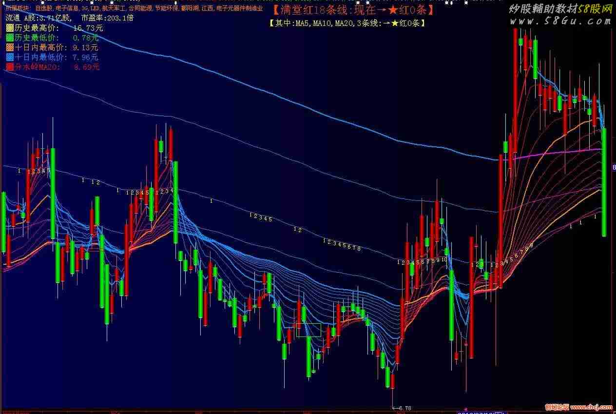 B1:EMA(C,3),COLORFF9900; B2:EMA(C,5),COLORFF9900,LINETHICK2; B3:EMA(C,7),COLORFF9900; B4:EMA(C,10),COLORFF9900; B5:EMA(C,15),COLORFF9900; B6:EMA(C,20),COLORFF9900,LINETHICK2; B7:EMA(C,25),COLORFF9900; B8:EMA(C,30),COLORFF9900; B9:EMA(C,35),COLORFF9900; B10:EMA(C,40),COLORFF9900; B11:EMA(C,45),COLORFF9900; B12:EMA(C,50),COLORFF9900; B13:EMA(C,55),COLORFF9900; B14:EMA(C,60),COLORFF9900,LINETHICK2; B15:EMA(C,85),COLORFF9900; B16:EMA(C,120),COLORFF9900; B17:EMA(C,180),COLORFF9900; B18:EMA(C,240),COLORFF9900,LINETHICK2; partline(B1,B1>REF(B1,1),rgb(255,0,0)); partline(B2,B2>REF(B2,1),rgb(255,0,10)),LINETHICK2; partline(B3,B3>REF(B3,1),rgb(255,0,20));; partline(B4,B4>REF(B4,1),rgb(255,0,30)); partline(B5,B5>REF(B5,1),rgb(255,0,40)); partline(B6,B6>REF(B6,1),rgb(255,120,0)),LINETHICK2; partline(B7,B7>REF(B7,1),rgb(255,0,60)); partline(B8,B8>REF(B8,1),rgb(255,0,70)); partline(B9,B9>REF(B9,1),rgb(255,0,80)); partline(B10,B10>REF(B10,1),rgb(255,0,90)); partline(B11,B11>REF(B11,1),rgb(255,0,100)); partline(B12,B12>REF(B12,1),rgb(255,0,110)); partline(B13,B13>REF(B13,1),rgb(255,0,120)); partline(B14,B14>REF(B14,1),rgb(255,150,0)),LINETHICK2; partline(B15,B15>REF(B15,1),rgb(255,0,180)); partline(B16,B16>REF(B16,1),rgb(255,0,200)); partline(B17,B17>REF(B17,1),rgb(255,0,220)); partline(B18,B18>REF(B18,1),rgb(255,0,255)),LINETHICK2; 红线1:if(B1>REF(B1,1),1,0),LINETHICK0; 红线2:if(B2>REF(B2,1),1,0),LINETHICK0; 红线3:if(B3>REF(B3,1),1,0),LINETHICK0; 红线4:if(B4>REF(B4,1),1,0),LINETHICK0; 红线5:if(B5>REF(B5,1),1,0),LINETHICK0; 红线6:if(B6>REF(B6,1),1,0),LINETHICK0; 红线7:if(B7>REF(B7,1),1,0),LINETHICK0; 红线8:if(B8>REF(B8,1),1,0),LINETHICK0; 红线9:if(B9>REF(B9,1),1,0),LINETHICK0; 红线10:if(B10>REF(B10,1),1,0),LINETHICK0; 红线11:if(B11>REF(B11,1),1,0),LINETHICK0; 红线12:if(B12>REF(B12,1),1,0),LINETHICK0; 红线13:if(B13>REF(B13,1),1,0),LINETHICK0; 红线14:if(B14>REF(B14,1),1,0),LINETHICK0; 红线15:if(B15>REF(B15,1),1,0),LINETHICK0; 红线16:if(B16>REF(B16,1),1,0),LINETHICK0; 红线17:if(B17>REF(B17,1),1,0),LINETHICK0; 红线18:if(B18>REF(B18,1),1,0),LINETHICK0; 满堂红:红线1+红线2+红线3+红线4+红线5+红线6+红线7+红线8+红线8+红线10+红线11+红线12+红线13+红线14+红线15+红线16+红线17+红线18,PRECIS0,LINETHICK0; 分水岭:红线2+红线4+红线6,PRECIS0,LINETHICK0; DRAWTEXTABS(550,5,'【满堂红18条线:现在→★红'+NUMTOSTRN(满堂红,0)+'条】'),Color0044ff,LINETHICK5,PRECIS0; DRAWTEXTABS(545,35,'【其中:MA5,MA10,MA20,3条线:→★红'+NUMTOSTRN(分水岭,0)+'条】'),Color00FFff,LINETHICK3,PRECIS0; DRAWTEXTABS(10,45,'▓历史最高价: '+NUMTOSTRN(HHV(HIGH,0),2)+'元 ' ),Color00FFFF,LINETHICK3; DRAWTEXTABS(10,65,'▓历史最低价: '+NUMTOSTRN(LLV(LOW,0),2)+'元 ' ),Color00FF00,LINETHICK3; DRAWTEXTABS(10,85,'▓十日内最高价: '+NUMTOSTRN(hhv(h,10),2)+'元'),Color0099FF,LINETHICK3; DRAWTEXTABS(10,105,'▓十日内最低价: '+NUMTOSTRN(LLV(LOW,10),2)+'元'),ColorFF9900,LINETHICK3; DRAWTEXTABS(10,125,'▓分水岭MA20: '+NUMTOSTRN(B6,2)+'元'),Color0000FF,LINETHICK3;