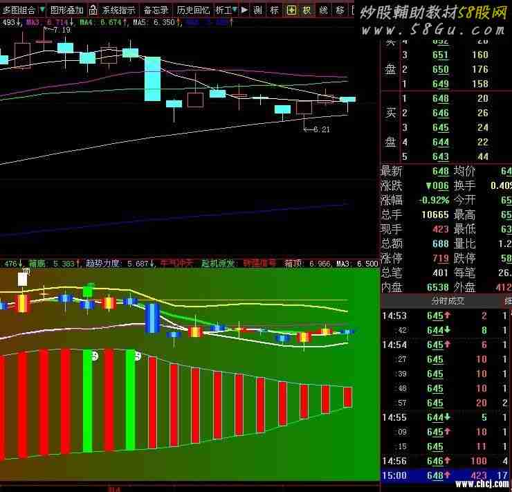 转强信号:STICKLINE(趋势力度>REF(趋势力度,1) AND 趋势力度<Varc-0.5,Varc-0.5,趋势力度,2,0),colorred;箱顶: HHV(MA((LOW+HIGH+CLOSE+OPEN)/4,5),58),color00aaff; MA3: MA(CLOSE,3),LINETHICK2,colorwhite; MA34: MA(CLOSE,34),colorff00ff; DRAWTEXT(CROSS(MA3,箱底),LOW*0.95,'试'),colorffffff; STICKLINE(CROSS(MA3,箱底),LOW*0.97,l*0.95,4,0),colorffcc66; DRAWTEXT(CROSS(MA3,MA34),LOW*0.95,'买'),colorred; STICKLINE(CROSS(MA3,MA34),LOW*0.97,l*0.95,4,0),colorff00ff; DRAWTEXT(CROSS(MA3,箱顶) AND CLOSE>箱顶,箱顶*0.95,'追'),coloryellow; STICKLINE(CROSS(MA3,箱顶) AND CLOSE>箱顶,箱顶*0.97,箱顶*0.95,4,0),coloryellow; DRAWTEXT(CROSS(箱顶,MA3) AND CLOSE<箱顶,HIGH*1.03,'卖'),color00ff00; STICKLINE(CROSS(箱顶,MA3) AND CLOSE<箱顶,HIGH*1.02,h*1.0,4,0),color00ff00; DRAWTEXT(REF(VarA,2)<REF(VarA,1) AND REF(VarA,1)>VarA AND VarA>箱顶 AND CLOSE>箱顶,HIGH*1.04,'顶'),colorwhite; STICKLINE(REF(VarA,2)<REF(VarA,1) AND REF(VarA,1)>VarA AND VarA>箱顶 AND CLOSE>箱顶,HIGH*1.005,h*1.03,4,0),colorwhite;