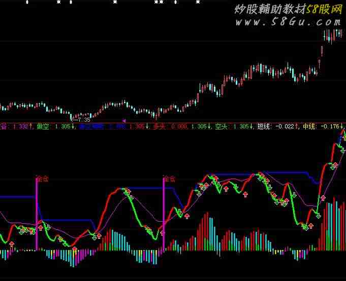 拉升力:=(CLOSE-LLV(LOW,28))/(HHV(HIGH,30)-LLV(LOW,36))*0.6*CLOSE; 拉升力A:=SMA(拉升力,6.3,1); 波峰波谷:SMA(拉升力A,3,1),COLORFF00FF; 拉升力B:=3*拉升力A-2.1*波峰波谷; 空方:=3*波峰波谷-1* 拉升力A; 做空:IF(空方>拉升力B,拉升力B,空方),LINETHICK2,COLOR00FF00; 做空周期:HHV(做空,21),COLORBLUE,LINETHICK2; partline(做空,做空>=REF(做空,1) ),COLORRED,LINETHICK3; 多头:IF(做空>=REF(做空,1) ,做空,0),COLORRED,LINETHICK0; DRAWICON(做空>=REF(做空,1) AND REF(做空,1)<REF(做空,2),做空,7); partline(做空,做空<REF(做空,1)),COLORGREEN,LINETHICK3; 空头:IF(做空<REF(做空,1),做空,0),COLORGREEN,LINETHICK0;