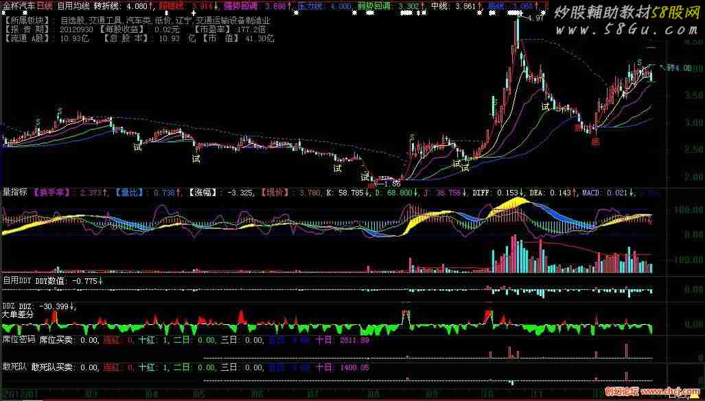 DRAWGBK(c>0),color000000; 【换手率】:vol/capital*100,LINETHICK0,COLORDD00DD; 【量比】:VOL/ref(MA(VOL,5),1),LINETHICK0,colorFF8800; 【涨幅】:DYNAINFO(14)*100,LINETHICK0,COLORDDDDDD; 【现价】:DYNAINFO(7),LINETHICK0,COLOR5050dd; RSV:=(CLOSE-LLV(LOW,9))/(HHV(HIGH,9)-LLV(LOW,9))*100; K:SMA(RSV,3,1),LINETHICK0,COLORWHITE; D:SMA(K,3,1),LINETHICK1,COLOR00FF00,LAYER1; J:3*K-2*D,LINETHICK1,COLORFF00FF,LAYER0; DIFF:EMA(CLOSE,12)-EMA(CLOSE,26),linethick0,COLORFFFFFF; DEA :EMA(DIFF,9),linethick0,COLOR00FFFF; MACD:2*(DIFF-DEA),COLORFF9999,linethick0; rsv1:=(hhv(h,9.8)-c)/(hhv(h,9.8)-llv(l,9.8))*101; kk:=sma(rsv1,3,1); dd:=sma(kk,3,1); jj:=3*kk-2*dd; 买卖:=if(jj>=100,100,if(jj<=0,0,jj)); if(买卖=100,0-10,0),color661100; if(买卖=0,90,100),color661100; KX:=250; KH:=HHV(K,KX); DH:=HHV(D,KX); JH:=HHV(J,KX); KL:=LLV(K,KX); DL:=LLV(D,KX); JL:=LLV(J,KX); HKMAX:=MAX(KH,MAX(DH,JH)); LKMIN:=MIN(KL,MIN(DL,JL)); KHLB:=(HKMAX+LKMIN)/2; KHLC:=HKMAX-LKMIN; MHF:=HHV(DIFF,KX); MHD:=HHV(DEA,KX); MHM:=HHV(MACD,KX); MLF:=LLV(DIFF,KX); MLD:=LLV(DEA,KX); MLM:=LLV(MACD,KX); HMAX:=MAX(MHF,MAX(MHD,MHM)); LMIN:=MIN(MLF,MIN(MLD,MLM)); FHLB:=(HMAX-LMIN)/100; FHLC:=HMAX-LMIN; SH:=(0-FHLB)*(KHLC/FHLC)+KHLB; DIFFA:=(DIFF-FHLB)*(KHLC/FHLC)+KHLB; DEAA:=(DEA-FHLB)*(KHLC/FHLC)+KHLB; MACDA:=(macd-FHLB)*(KHLC/FHLC)+KHLB; CDA:=MACD<ref(MACD,1) and MACD>0; CDB:=MACD>=ref(MACD,1) and MACD>0; CDC:=MACD>ref(MACD,1) and MACD<0; CDD:=MACD<=ref(MACD,1) and MACD<0; STICKLINE(MACD>=0,SH,macda,1,0),COLOR5050FF,LAYER3; STICKLINE(MACD<0,SH,macda,1,0),COLORFFFF00,LAYER3; FILLRGN(DIFFA,DEAA,DIFF>=DEA),COLOR00FFFF,LAYER7; FILLRGN(DIFFA,DEAA,DIFF<DEA),COLORFF5500,LAYER7; DIFFA,COLORAAAAAA,LAYER2;DEAA,COLOR00AAAA,LAYER2; {1、叠加区域高度} khV:=0; klV:=-150; rhV:=hhvall(V); rlV:=llvall(V); {2、叠加比} brV:=(khV-klV)/(rhV-rlV); {3、叠加平移量} wkV:=(khV-klV); wrV:=(khV+klV-(rhV+rlV)*brV)/2; {以下画叠加线} 量线:=(V*brV+wrV); {以下画叠加指标的横坐标线} STICKLINE(C<O,-150,量线,7.5,0),COLORFFFF00,LAYER3; STICKLINE(C>=O,-150,量线,7.5,1),COLOR5050FF,LAYER3; AAA0:=量线; VAR111:=(8*AAA0+7*REF(AAA0,1)+6*REF(AAA0,2)+5*REF(AAA0,3)+4*REF(AAA0,4)+3*REF(AAA0,5)+2*REF(AAA0,6)+REF(AAA0,7))/36; VAR21:=(HHV(VAR111,5)+HHV(VAR111,10)+HHV(VAR111,20))/3; 主力线:(HHV(VAR21,5)+HHV(VAR21,10)+HHV(VAR21,20))/3,linethick1,color0000FF,LAYER1; STICKLINE(量线>=主力线,-150,量线,4,1),COLORFF00FF,LAYER7;