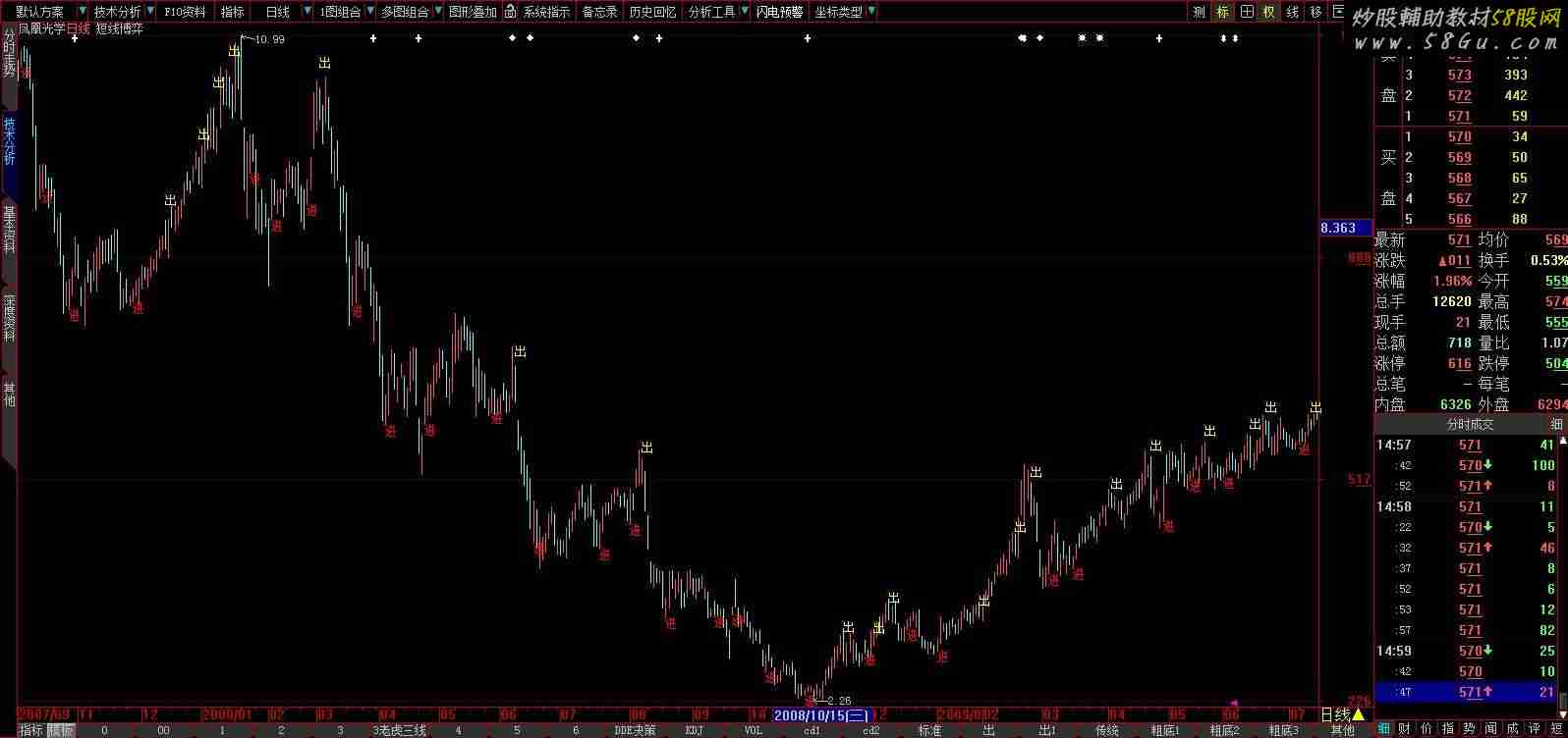 本公式包含网络(不来自本坛!)许多相关公式精华,经反复优化而来。对实战有一定指导意义。当“进”出现买入,“出”出现卖出。用于主图。 《短线博弈》: var1:=C-REF(C,1); var2:=100*EMA(EMA(var1,6),6)/EMA(EMA(ABS(var1),6),6); var3:=IF(LLV(var2,2)=LLV(var2,7) AND COUNT(var2<0,2) AND CROSS(var2,MA(var2,2)),1,0); VAR4:=REF(CLOSE,1); VAR5:=((SMA(MAX(CLOSE-VAR4,0),7,1))/(SMA(ABS(CLOSE-VAR4),7,1)))*(100); VAR6:=CROSS(69,VAR5); VAR7:=(FILTER(VAR6,4)); DRAWTEXT(FILTER(var3=1,5),l,'进'),CoLorred; DRAWTEXT(VAR7,h*1.04,'出'),CoLoryellow; |