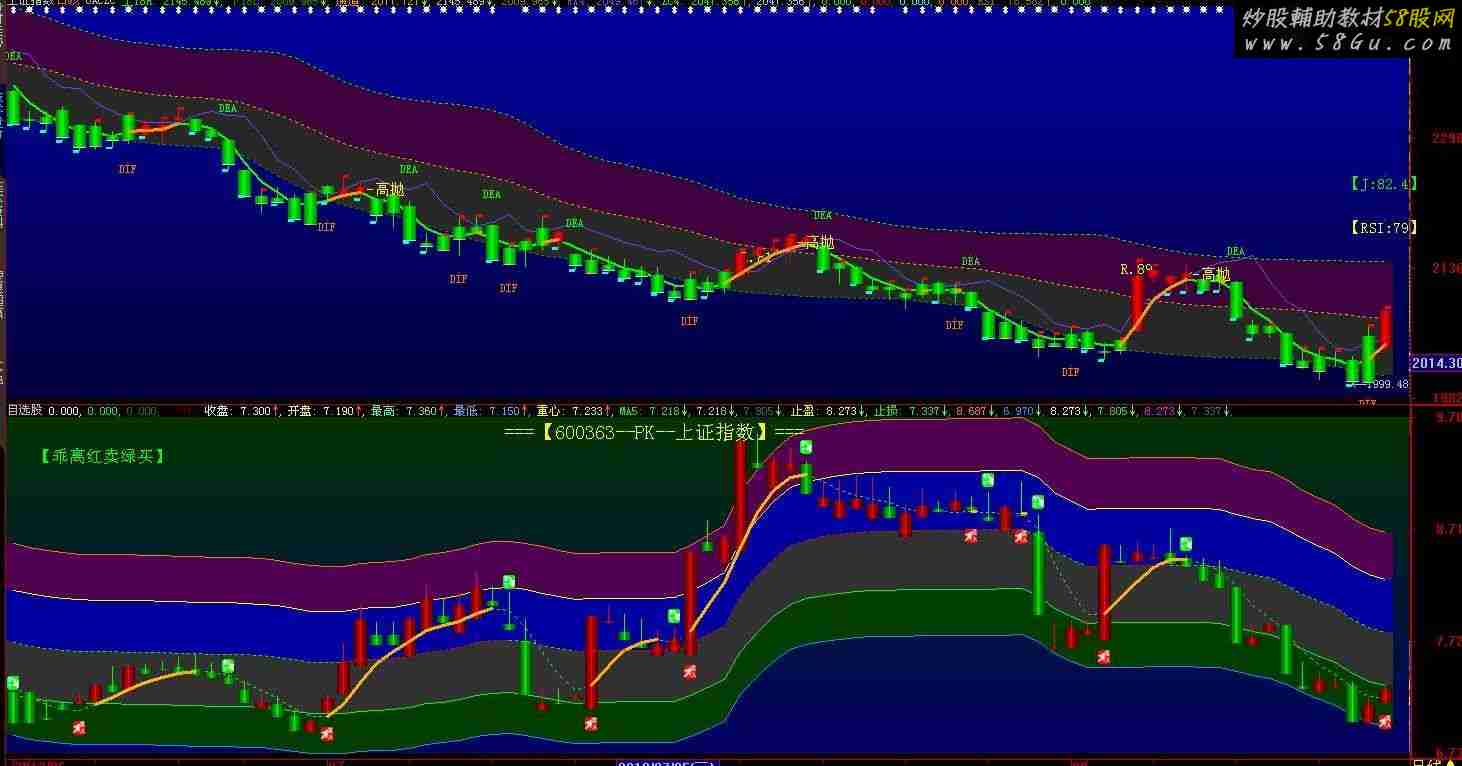 【自选股】是个固定的副图可以PK任意主图.就是只要填入你想要固定的副图股票代码.就可以配合任意的主图.对比他们的趋势变化.副图可以是你的自选股.大盘.对应板块.等等 小图的买卖是超级短线必然有失误.仅供参考.不是还有MA5配合.还有通道配合.把问题综合起来看就没用问题了.历来我们都不要你【只看头不看尾】.还是要【兼听则明偏信则暗】.不妨看看其他指标如何再【三思而后行】 其中两个小图引入的大智慧文件夹userdata/bmp里 如果你没有【05引】你必需建立个引入文件如下:------------ {05引} CL:C,LINETHICK0; OL:O,LINETHICK0; HL:H,LINETHICK0; LL:L,LINETHICK0; 源码如下:------------------------------------------------------------------------------------------------------------------------- 任意股:='600363'; {选择你要关心的股票代码.例如上证:SH000001} DRAWGBKlast(DATE>900101,strip(RGB(0,50,0),RGB(0,0,100),0)); DRAWTEXTABS(500,5,'===【'+任意股+'--PK--'+ STKNAME+'】==='),Color00FFFF,LINETHICK4; ZSC:=STKINDI(任意股,'05引.CL'); ZSO:=STKINDI(任意股,'05引.OL'); ZSH:=STKINDI(任意股,'05引.HL'); ZSL:=STKINDI(任意股,'05引.LL'); {股票的k线} STICKLINE(ZSC>ZSO,ZSO,ZSH,0.5 ,0 ),COLOR0000FF; STICKLINE(ZSO>=ZSC,ZSO,ZSH,0.5 ,0 ),COLOR00FF00; STICKLINE((ZSC <= ZSO),ZSC,ZSO,8,0),color004400; STICKLINE((ZSC <= ZSO),ZSC,ZSO,7,0),color006600; STICKLINE((ZSC <= ZSO),ZSC,ZSO,5,0),color008800; STICKLINE((ZSC <= ZSO),ZSC,ZSO,3,0),COLOR00BB00; STICKLINE((ZSC <= ZSO),ZSC,ZSO,1,0),COLOR00FF00; STICKLINE(ZSC>ZSO,ZSC,ZSO,8,0) ,COLOR000044; STICKLINE(ZSC>ZSO,ZSC,ZSO,7,0) ,COLOR000066; STICKLINE(ZSC>ZSO,ZSC,ZSO,5,0) ,COLOR000088; STICKLINE(ZSC>ZSO,ZSC,ZSO,3,0) ,COLOR0000BB; STICKLINE(ZSC>ZSO,ZSC,ZSO,1,0) ,COLOR0000FF; 收盘:ZSC,LINETHICK0,COLORFFFFCC; 开盘:ZSO,LINETHICK0,Color9DFFFF; 最高:ZSH,LINETHICK0,ColorABFF46; 最低:ZSL,LINETHICK0,COLORFFAA66;{红股.绿币的趋势线} {MA5} 重心:WMA((2*ZSC+ZSH+ZSL)/4,2),COLOR00FFFF,LINETHICK0; MA5:WMA(重心,5),COLOR00FF00,DOTLINE; PARTLINE(MA5 ,(MA5>REF(MA5,1)),rgb(255,180,0) ),linethick3,LAYER0; {.吸入抛出} Var6:=(2*ZSC+ZSH+ZSL)/4; Var8:=LLV(ZSL,34); VarA:=HHV(ZSH,34); BM:=EMA((Var6-Var8)/(VarA-Var8)*100,3); BM1:=EMA(BM,3); AA:=BM-BM1>=0; BB:=BM-BM1<0; drawbmp(CROSS(AA,BB),(ZSL*0.99),'BU.bmp'),align1,valign0,LAYER0; drawbmp(CROSS(BB,AA),(ZSH*1.02),'SE.bmp'),align1,valign0,LAYER0;{乖离止盈止损} DRAWTEXTABS(30,30,'【乖离红卖绿买】'),LINETHICK3,Color00FF00; M20:=MA(ZSC,18); 乖离20:=ABS((2*ZSC+ZSH+ZSL)/4-M20)/M20; 乖离线:=DMA(ZSC,乖离20); PARTLINE(乖离线 ,(乖离线>REF(乖离线,1))-1,rgb(0,255,0),1,rgb(255,0,0) ),DOTLINE,LAYER0; 止盈:乖离线*1.06,COLOR00ffff,LINETHICK1; {20天均线乖离+6%} 止损:乖离线*0.94,COLOR00ff00,LINETHICK1; {20天均线乖离-6%} 止盈*1.05,COLOR0077ff; 止损*0.95,COLORff9900; FILLRGN(止盈,乖离线,止盈>乖离线,RGB(0,0,160)),LAYER7; FILLRGN(乖离线,止损,乖离线>止损,RGB(50,50,50)),LAYER7; FILLRGN(止盈,止盈*1.05,止盈<止盈*1.05,RGB(80,0,80)),LAYER7; FILLRGN(止损,止损*0.95,止损>止损*0.95,RGB(0,60,0)),LAYER7;