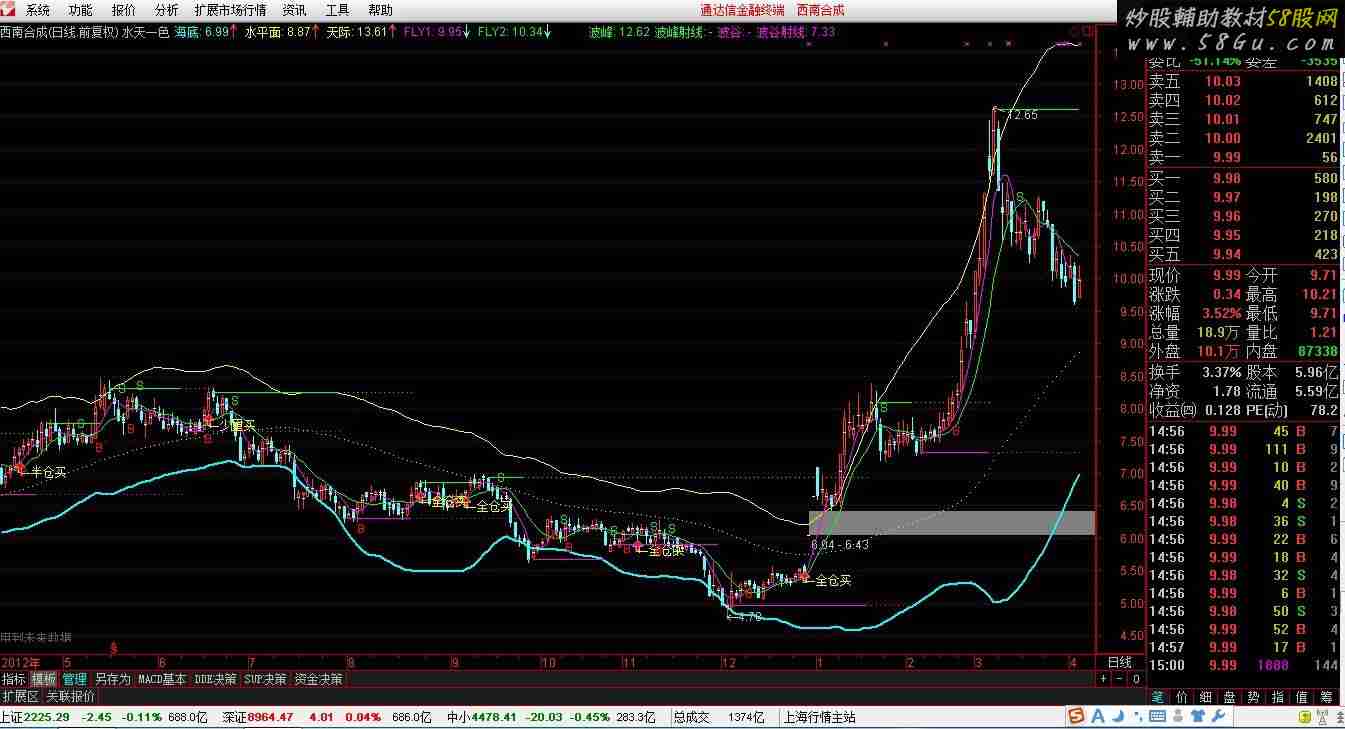 VAR1:=MA(CLOSE,30); 海底: VAR1-2*STD(CLOSE,60),COLORCYAN,LINETHICK2; 水平面: MA(CLOSE,60),POINTDOT; 天际: VAR1+2*STD(CLOSE,60),; FLY1: MA(CLOSE,5),; FLY2: MA(CLOSE,10),; VAR2:=CROSS(MA(CLOSE,5),MA(CLOSE,30)); DRAWICON(VAR2,LOW-LOW*0.01,1); DRAWTEXT(VAR2 AND CLOSE>MA(CLOSE,250),LOW-LOW*0.02,'←少量买 '),COLORYELLOW; DRAWTEXT(VAR2 AND CLOSE>=MA(CLOSE,60) AND CLOSE<=MA(CLOSE,250),LOW-LOW*0.02,'←半仓买'),COLORYELLOW; DRAWTEXT(VAR2 AND CLOSE<MA(CLOSE,60),LOW-LOW*0.02,'←全仓买 '),COLORYELLOW; 买线:=EMA(C,2); 卖线:=EMA(SLOPE(C,21)*20+C,42); BU:=CROSS(买线,卖线); SEL:=CROSS(卖线,买线); DRAWTEXT(BU,LOW*0.98,'B'),,,COLORRED; DRAWTEXT(SEL,HIGH*1.02,'S'),,,COLORGREEN; TY:=C; A1:=REF(TY,10)=HHV(TY,2*10+1); B1:=FILTER(A1,10); C1:=BACKSET(B1,10+1); HD:=FILTER(C1,10); A2:=REF(TY,10)=LLV(TY,2*10+1); B2:=FILTER(A2,10); C2:=BACKSET(B2,10+1); LD:=FILTER(C2,10); A:=REF(C,BARSLAST(HD)); B:=REF(C,BARSLAST(LD)); T1:=BARSLAST(HD)<BARSLAST(LD) AND NOT(HD) ; T2:=BARSLAST(HD)>BARSLAST(LD) AND NOT(LD); 波峰:IF(T1>=1,A,DRAWNULL),COLOR00FF20; 波峰射线:IF(T1<1,A,DRAWNULL),POINTDOT,COLOR00FF20; 波谷:IF(T2>=1,B,DRAWNULL),COLORFF00FF; 波谷射线:IF(T2<1,B,DRAWNULL),POINTDOT,COLORFF00FF; YY:=(H+L+C)/3;DRAWKLINE(YY,YY,YY,YY+0.00006),COLORGREEN;