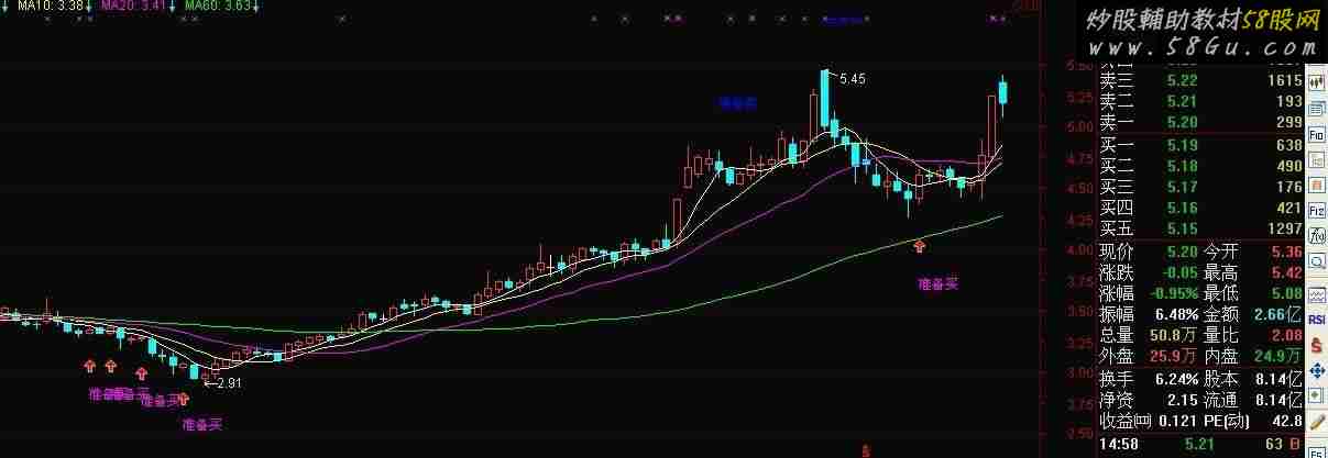 MA5:MA(C,5); MA10:MA(C,10); MA20:MA(C,20); MA60:MA(C,60); LC:=REF(CLOSE,1); RSI5:=((SMA(MAX((CLOSE - LC),0),5,1) / SMA(ABS((CLOSE - LC)),5,1)) * 100); VARR1:=SMA(MAX(CLOSE-REF(C,1),0),12,1)/SMA(ABS(CLOSE-REF(C,1)),15,1)*100; TR1:=SUM(MAX(MAX((HIGH - LOW),ABS((HIGH - REF(CLOSE,1)))),ABS((LOW - REF(CLOSE,1)))),10); HD:=(HIGH - REF(HIGH,1)); LD:=(REF(LOW,1) - LOW); DMP:=SUM(IF(((HD > 0) AND (HD > LD)),HD,0),10); DMM:=SUM(IF(((LD > 0) AND (LD > HD)),LD,0),10); PDI:=((DMP * 100) / TR1); MDI:=((DMM * 100) / TR1); ADX:=MA(((ABS((MDI - PDI)) / (MDI + PDI)) * 100),5); AV:=(RSI5 + ADX); DXR:=(((ADX + REF(ADX,5)) / 2) + RSI5); WR10:=((100 * (HHV(HIGH,10) - CLOSE)) / (HHV(HIGH,10) - LLV(LOW,10))); NEWVOL:=(RSI5 - WR10); 准备买:=(AV + NEWVOL); DRAWTEXT(CROSS(准备买,0),L*0.85,'准备买'),COLORFF00FF; DRAWICON(CROSS(准备买,0),L*0.92,1); DRAWTEXT(CROSS(82,VARR1),H*1.08,'准备卖'),COLORBLUE;