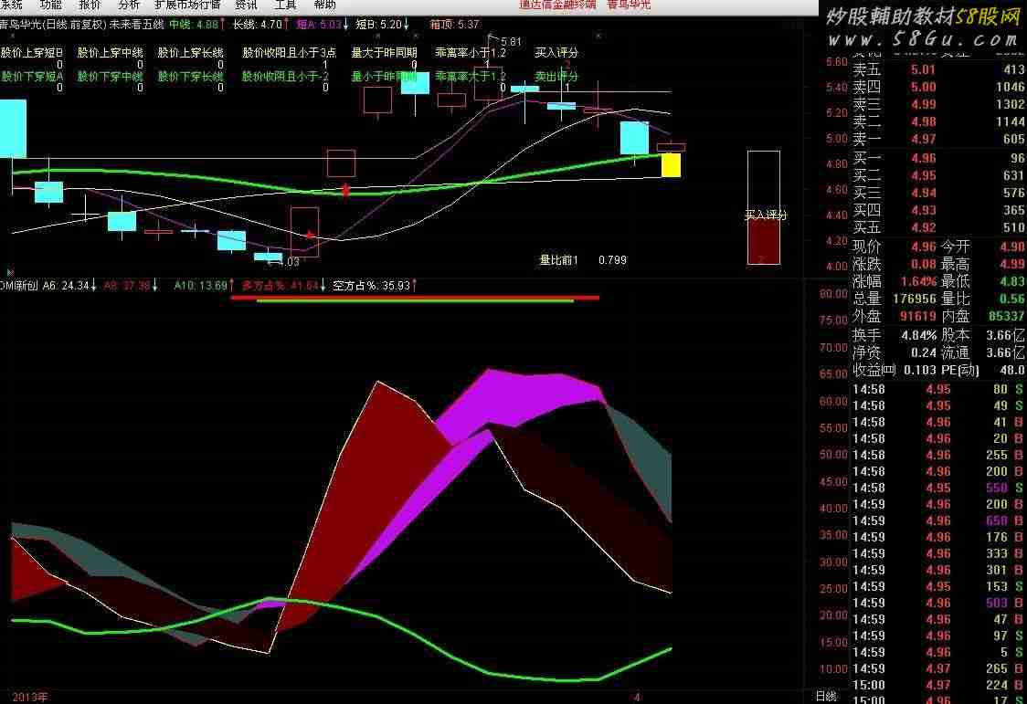 A1:=EXPMEMA(MAX(MAX(H-L,ABS(H-REF(C,1))),ABS(REF(C,1)-L)),10); A2:=H-REF(H,1); A3:=REF(L,1)-L; A4:=EXPMEMA(IF(A2>0 AND A2>A3,A2,0),10); A5:=EXPMEMA(IF(A3>0 AND A3>A2,A3,0),10); A6:A4*100/A1,COLORYELLOW,LINETHICK3; A6M5:=MA(A6,5); A7:=A5*100/A1; A8:EXPMEMA(ABS(A6-A7)/(A6+A7)*100,6),COLORRED,LINETHICK3; A9:=EXPMEMA(A8,5); DRAWBAND(A8,RGB(192,14,235),A9,RGB(47,79,79)); DRAWBAND(A6,125,A6M5,30); A10:MA(A7,5),COLORGREEN,LINETHICK3; B1:=(C-O)/(H-L)*V; B2:=(H-C)/(H-L)*V; B3:=(O-L)/(H-L)*V; 当日上攻量:=B1*0.7+B2*0.5+B3*0.4,VOLSTICK; 当日出货量:=A1*0.3+A2*0.5,NODRAW,COLORGREEN; 当日杀跌量:=B3*0.6,NODRAW,COLORBLUE; 五日上攻量:=SUM(当日上攻量,5),COLORRED; 五日出货量:=SUM(当日出货量,5),COLORGREEN,LINETHICK2; 五日杀跌量:=SUM(当日杀跌量,5),COLORBLUE,LINETHICK2; 多方占%:五日上攻量/SUM(V,5)*100,COLORRED,NODRAW; 空方占%:(五日出货量+五日杀跌量)/SUM(V,5)*100,NODRAW; STICKLINE(CURRBARSCOUNT=8,79,79.5,多方占%,0),COLORRED; STICKLINE(CURRBARSCOUNT=8,78.9,78.4,空方占%,0),COLORGREEN;