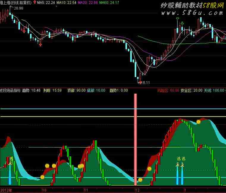 趋势:SMA(((CLOSE-LLV(LOW,28))/(HHV(HIGH,28)-LLV(LOW,28))*100),3,1) ,COLORGREEN; STICKLINE(趋势>50,趋势,50,4,0),COLOR32329B; STICKLINE(50>趋势,趋势,50,4,0),COLOR326400; IF(趋势>50, 趋势,DRAWNULL), COLORRED; RSV:=(CLOSE-LLV(CLOSE,9))/(HHV(CLOSE,9)-LLV(CLOSE,9))*100; K:=SMA(RSV,3,1); D:=SMA(K,3,1); TYP:=(HIGH+LOW+CLOSE)/3; CCI:=(TYP-MA(TYP,14))/(0.015*AVEDEV(TYP,14)); DIFF:=EMA(CLOSE,2)-EMA(CLOSE,55); DEA:=EMA(DIFF,6); MACD:=2*(DIFF-DEA); 转点:=IF(K>D AND CCI>0 AND DIFF>DEA AND MACD>0,1,0); STICKLINE(转点=1,50,50,6,0),COLORYELLOW; STICKLINE(转点=0,50,50,6,0),COLORCYAN; 顶部:90,COLORYELLOW; 底部:10,COLORCYAN; 判断:SMA(趋势,3,1),COLORFF00FF, LINETHICK2; IF( 趋势>判断,判断,DRAWNULL), COLORYELLOW, LINETHICK2; IF( 趋势<判断,判断,DRAWNULL) ,COLORFFF000,LINETHICK2; DRAWICON(CROSS(趋势,判断),判断,1); DRAWICON(CROSS(趋势,顶部),顶部,2); LC:= REF(CLOSE,1); RSI:=SMA(MAX(CLOSE-LC,0),6,1)/SMA(ABS(CLOSE-LC),6,1)*100; VAR1:=(HHV(HIGH,9)-CLOSE)/(HHV(HIGH,9)-LLV(LOW,9))*100-70; VAR2:=SMA(VAR1,9,1)+100; VAR3:=(CLOSE-LLV(LOW,9))/(HHV(HIGH,9)-LLV(LOW,9))*100; VAR4:=SMA(VAR3,3,1); VAR5:=SMA(VAR4,3,1)+100; VAR6:=VAR5-VAR2; 趋势1: IF(VAR6>45,VAR6-45,0),COLOR00FFFF; VAR2Q:=REF(LOW,1); VAR3Q:=SMA(ABS(LOW-VAR2Q),3,1)/SMA(MAX(LOW-VAR2Q,0),3,1)*100; VAR4Q:=EMA(IF(CLOSE*1.3,VAR3Q*10,VAR3Q/10),3); VAR5Q:=LLV(LOW,30); VAR6Q:=HHV(VAR4Q,30); VAR7Q:=IF(MA(CLOSE,58),1,0); VAR8Q:=EMA(IF(LOW<=VAR5Q,(VAR4Q+VAR6Q*2)/2,0),3)/999*VAR7Q; 火焰山:=IF(VAR8Q>100,100,VAR8Q); STICKLINE(火焰山>0,0 ,火焰山*1.2,5,0 ),COLOR4444FF; STICKLINE(火焰山>0,0 ,火焰山*1.2,4,0 ),COLOR5555FF; STICKLINE(火焰山>0,0 ,火焰山*1.2,3,0 ),COLOR7777FF; STICKLINE(火焰山>0,0 ,火焰山*1.2,2,0 ),COLOR9999FF; STICKLINE(REF(趋势1,1)< 趋势1, 趋势1,REF(趋势1,1),5,0),COLOR000033; STICKLINE(REF(趋势1,1)< 趋势1, 趋势1,REF(趋势1,1),4,0),COLOR000055; STICKLINE(REF(趋势1,1)< 趋势1, 趋势1,REF(趋势1,1),3,0),COLOR000077; STICKLINE(REF(趋势1,1)< 趋势1, 趋势1,REF(趋势1,1),2,0),COLOR000099; STICKLINE(REF(趋势1,1)< 趋势1, 趋势1,REF(趋势1,1),1.5,0),COLOR0000BB; STICKLINE(REF(趋势1,1)< 趋势1, 趋势1,REF(趋势1,1),1,0),COLOR0000DD; STICKLINE(REF(趋势1,1)> 趋势1, 趋势1,REF(趋势1,1),5,0),COLOR003300; STICKLINE(REF(趋势1,1)> 趋势1, 趋势1,REF(趋势1,1),4,0),COLOR005500; STICKLINE(REF(趋势1,1)> 趋势1, 趋势1,REF(趋势1,1),3,0),COLOR007700; STICKLINE(REF(趋势1,1)> 趋势1, 趋势1,REF(趋势1,1),2,0),COLOR009900; STICKLINE(REF(趋势1,1)> 趋势1, 趋势1,REF(趋势1,1),1,0),COLOR00DD00; 逃顶:=CROSS(82,RSI); STICKLINE( 逃顶,逃顶,20,5,0),COLORFF5500; STICKLINE( 逃顶,逃顶,30,3,0),COLORFF8800; STICKLINE( 逃顶,逃顶,30,2,0),COLORFFAA00; STICKLINE( 逃顶,逃顶,30,1,0),COLORFFCC00; D1:=(C+L+H)/3; D2:=EMA(D1,6); D3:=EMA(D2,5); BBUY:=CROSS(D2,D3); 风险区:80,COLORFF85FF; 安全区:20,COLORYELLOW,POINTDOT; 天线:100,COLORFFFF00; 强弱线:50,COLORGREEN,POINTDOT; DRAWICON(BBUY,(LOW *1),1); VARR1:=SMA(MAX(CLOSE-REF(C,1),0),6,1)/SMA(ABS(CLOSE-REF(C,1)),6,1)*100; DRAWICON(CROSS(82,VARR1),HIGH,15); DRAWTEXT(CROSS(82,VARR1),35,'逃'),COLORYELLOW;