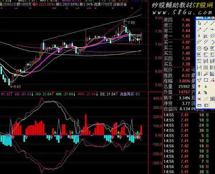 ZZ:=(HHV(H,3)+LLV(L,3))/2;A:=IF(C>ZZ,VOL,0);B:=IF(C<ZZ,VOL,0); 总0:=(A-B); 众赢BBD:EMA(总0,3)/SUM(VOL,5)*600,LINETHICK; BBD:=众赢BBD; STICKLINE(BBD>=0,0,BBD,3,0),COLOR000088; STICKLINE(BBD>=0,0,BBD,1.5,0),COLOR0000AA; STICKLINE(BBD>=0,0,BBD,1,0),COLOR0000CC; STICKLINE(BBD>=0,0,BBD,0.5,0),COLOR0000FF; STICKLINE(BBD<0,0,BBD,3,0),COLOR888800; STICKLINE(BBD<0,0,BBD,1.5,0),COLORAAAA00; STICKLINE(BBD<0,0,BBD,1,0),COLORCCCC00; STICKLINE(BBD<0,0,BBD,0.5,0),COLORFFFF00; XH1:=REF(BBD,1)<REF(BBD,2) AND REF(BBD,1)<-10 AND BBD>REF(BBD,1) AND BBD>0; XH2:=REF(BBD,1)>=REF(BBD,2) AND REF(BBD,1)>8 AND BBD<REF(BBD,1) AND BBD<0; DRAWICON(XH1,-20,1);DRAWICON(XH2,20,2); AA:=REF(CLOSE,1); BBB:=SMA(MAX(CLOSE-AA,0),21,1)/SMA(ABS(CLOSE-AA),21,1)*1000; HHH:=BBB-LLV(BBB,27); CCC:=LLV(BBB,27)-BBB; QQ:(MA(HHH,2)*3+HHH*13)/16,COLORFF00FF,LINETHICK1; SS:(MA(CCC,2)*3+CCC*13)/16,COLORFF00FF,LINETHICK1; GG:MA(HHH,5),LINETHICK1,COLORGREEN; MM:MA(CCC,5),LINETHICK1,COLORGREEN; WW:IF(QQ<GG,SS,MM),LINETHICK1,COLOR0000FF; EE:IF(SS<MM,GG,QQ),COLORFFFFCC,LINETHICK1; 买:=IF(EE-WW<5.6,200,0); {洗盘再买} RSVV:=(CLOSE-LLV(LOW,10))/(HHV(HIGH,10)-LLV(LOW,10))*100; VARB2:=(RSVV/2+22)*1; 量:=EMA(VOL,13); 资金:=EMA(AMOUNT,13); 过滤:=((资金 /量) / 100); 提纯:=(((CLOSE -过滤) / 过滤) * 100); 黄金:=((提纯 < (0)) AND ZXNH),COLORRED; 洗盘再买:IF(黄金 AND RSVV<VARB2-2,180,0),COLORFFAA99,LINETHICK1; VAR2:=LLV(LOW,10); VAR3:=HHV(HIGH,25); 小心: 3.2,COLORYELLOW; 风险: 3.5,COLORBLUE; 动力线:= EMA((CLOSE-VAR2)/(VAR3-VAR2)*4,4); STICKLINE(动力线>REF(动力线,1) ,动力线 ,REF(动力线,1),0,0),COLORRED; STICKLINE(动力线<=REF(动力线,1) ,动力线 ,REF(动力线,1),0,0),COLOR00FF00; 底部:0.2,COLORC6C600; 关注:0.5,COLORFF75FF; 强弱分界:1.75,COLORRED;