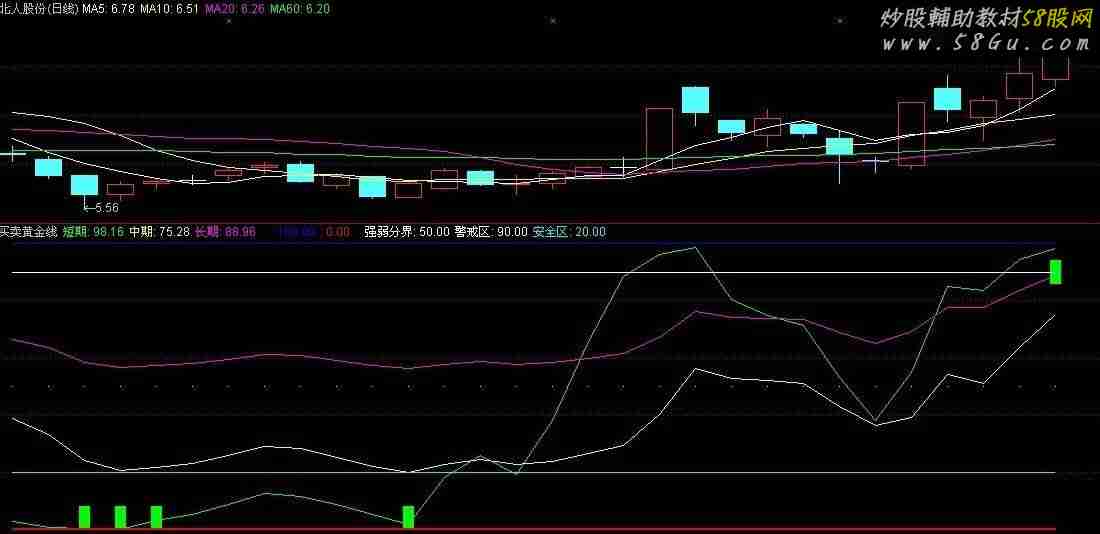 AA:=(O+H+L+C)/4; BB:=MA(AA,3); CC:=SUM(IF(AA>REF(AA,1),AA*VOL,0),4)/SUM(IF(AA<REF(AA,1),AA*VOL,0),4); DD:=REF(100-(100/(1+CC)),1); A1:=HHV(AA,15); A2:=LLV(AA,15); A3:=A1-A2; A4:=EMA((AA-A2)/A3,2)*100; B1:=HHV(AA,60); B2:=LLV(AA,60); B3:=B1-B2; B4:=EMA((AA-B2)/B3,2)*100; C1:=HHV(AA,240); C2:=LLV(AA,240); C3:=C1-C2; C4:=EMA((AA-C2)/C3,2)*100; 短期:A4,COLORGREEN; 中期:B4,COLORYELLOW; 长期:C4,COLORFF00FF; STICKLINE(短期>90 AND 中期>70,86,94,1,0),COLOR00FF00; STICKLINE(短期<5 AND 中期<30,0,8,1,0); IF(FILTER(中期<REF(中期,1)AND 中期>90 AND BB<REF(BB,1),5),80,100),COLORBLUE,LINETHICK2; IF(FILTER(中期>REF(中期,1)AND 中期<5 AND C>REF(C,1),5),20,0),COLORRED,LINETHICK2; D1:=中期>REF(中期,1) AND 短期>REF(短期,1)AND 长期>REF(长期,1)AND 长期<8 AND 中期<10 AND 短期<15; D2:=CROSS(短期,中期) AND 中期<8; D3:=CROSS(短期,长期) AND 长期<8 AND 中期<20; DRAWICON(FILTER((D1 OR D2 OR D3) AND DD<15 AND C>REF(C,1),5),5,1); DRAWICON(FILTER((中期<REF(中期,1)AND 短期<REF(短期,1)AND 长期<REF(长期,1)AND 中期>95 AND 短期>85)OR (长期>100 AND 中期>100 AND 短期>100),5),95,2); 强弱分界:50,POINTDOT,COLORWHITE; 警戒区:90,LINETHICK1,COLORWHITE; 安全区:20,COLORFFFF00;