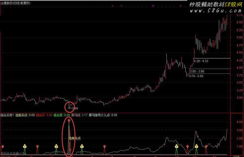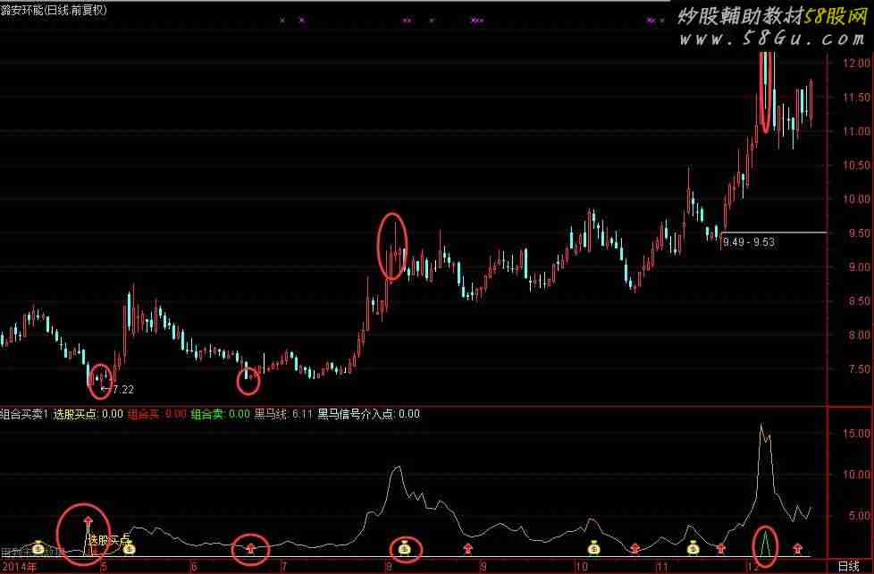 用了你就离不开的交易公式指标。话不多说,看图一目了然VAR3:=LLV(HIGH,240);VAR4:=100*(CLOSE-VAR3)/VAR3;VAR5:=(CLOSE-LLV(LOW,528))/(HHV(HIGH,528)-LLV(LOW,528))*100;VAR6:=(CLOSE-LLV(CLOSE,530))/(HHV(CLOSE,530)-LLV(CLOSE,530))*100;VAR8:=SMA(MAX(CLOSE-REF(CLOSE,1),0),34,1)/SMA(ABS(CLOSE-REF(CLOSE,1)),7,1)*100;VAR9:=SMA(MAX(CLOSE-REF(CLOSE,1),0),13,1)/SMA(ABS(CLOSE-REF(CLOSE,1)),13,1)*100;VARA:=BARSCOUNT(CLOSE);VARB:=VAR8<20 AND VAR9<23 AND VARA>35;VARC:=VARB AND COUNT(VARB,1)=1;VARD:=EMA(CLOSE,21)-EMA(CLOSE,8);VARE:=EMA(VARD,5);VARF:=TROUGHBARS(3,6,1)<4 AND CROSS(VARD,VARE);VAR10:=IF(TROUGHBARS(3,16,1)=0 AND HIGH>LOW+0.04,4,0);VAR11:=ZIG(3,6)>REF(ZIG(3,6),1) AND REF(ZIG(3,6),1)<=REF(ZIG(3,6),2) AND REF(ZIG(3,6),2)<=REF(ZIG(3,6),3);VAR12:=ZIG(3,6)<REF(ZIG(3,6),1) AND REF(ZIG(3,6),1)>=REF(ZIG(3,6),2) AND REF(ZIG(3,6),2)>=REF(ZIG(3,6),3);VAR13:=ZIG(3,22)>REF(ZIG(3,22),1) AND REF(ZIG(3,22),1)<=REF(ZIG(3,22),2) AND REF(ZIG(3,22),2)<=REF(ZIG(3,22),3);VAR14:=ZIG(3,22)<REF(ZIG(3,22),1) AND REF(ZIG(3,22),1)>=REF(ZIG(3,22),2) AND REF(ZIG(3,22),2)>=REF(ZIG(3,22),3);VAR15:=ZIG(3,51)>REF(ZIG(3,51),1) AND REF(ZIG(3,51),1)<=REF(ZIG(3,51),2) AND REF(ZIG(3,51),2)<=REF(ZIG(3,51),3);VAR16:=ZIG(3,51)<REF(ZIG(3,51),1) AND REF(ZIG(3,51),1)>=REF(ZIG(3,51),2) AND REF(ZIG(3,51),2)>=REF(ZIG(3,51),3);VAR17:=ZIG(3,72)>REF(ZIG(3,72),1) AND REF(ZIG(3,72),1)<=REF(ZIG(3,72),2) AND REF(ZIG(3,72),2)<=REF(ZIG(3,72),3);VAR18:=ZIG(3,72)<REF(ZIG(3,72),1) AND REF(ZIG(3,72),1)>=REF(ZIG(3,72),2) AND REF(ZIG(3,72),2)>=REF(ZIG(3,72),3);VAR19:=EMA(CLOSE,2)-EMA(CLOSE,150);VAR1A:=EMA(VAR19,100);VAR1B:=2*(VAR19-VAR1A);VAR1C:=POW(VAR1B,3)*0.1+POW(VAR1B,1);VAR1D:=SQRT(SQRT(LOW*HIGH*OPEN*CLOSE));VAR1E:=EMA(VAR1D*0.97,3);VAR1F:=(HIGH+LOW+CLOSE)/3;VAR20:=(VAR1F-MA(VAR1F,14))/(0.015*AVEDEV(VAR1F,14));VAR21:=CROSS(VAR1E,LOW);选股买点: VAR10, , COLORYELLOW;组合买: (VAR11+VAR13+VAR15+VAR17), , COLORRED;组合卖: (VAR12+VAR14+VAR16+VAR18), , COLORGREEN;黑马线: IF(MONTH<2008 AND VAR1B>0.1,VAR1C,0)*1, , COLOR6699CC;黑马信号介入点: 选股买点 AND VARF AND VARC AND VAR21 AND VAR4<0 AND VAR5<2 AND VAR6=0, , COLORFFFF99;DRAWTEXT(VAR13,0.6,'●'), ,COLORRED;DRAWICON(组合买,组合买,1);DRAWICON(组合卖,组合卖,9);DRAWTEXT(黑马信号介入点>0,4.5,'●我的黑马介入点'), , COLORRED;DRAWICON(选股买点>0,4.2,1);DRAWTEXT(选股买点 AND VARF AND VARC,2.8,' 30%下单莫错过!'), , COLORMAGENTA;DRAWTEXT(VAR18,3,'空仓'), , COLORGREEN;DRAWTEXT(VAR20<-110 AND 选股买点>0,2,'选股买点'), ,COLORYELLOW;DRAWTEXT(VAR17,1.3,'发现黑马'), , COLORFF6600;DRAWTEXT(选股买点 AND VAR20<-100 AND VARF AND VARC>0,4.1,'★组合5分钟线选股思路获利5%以上'), , COLORRED;